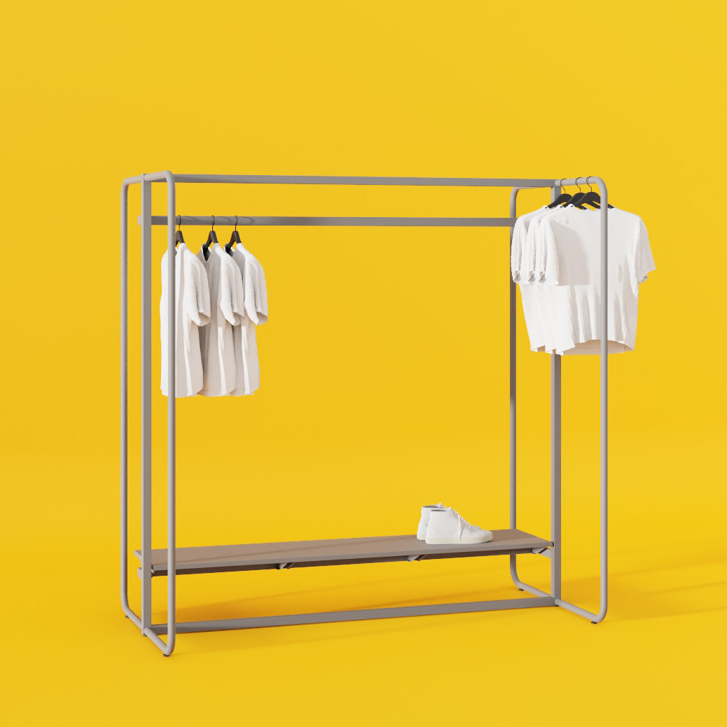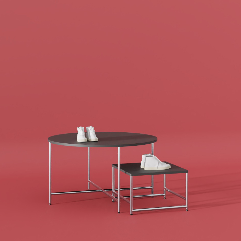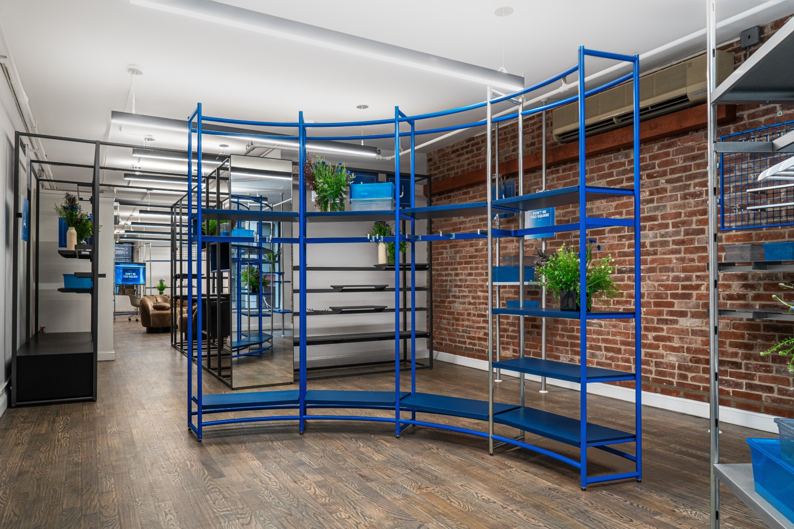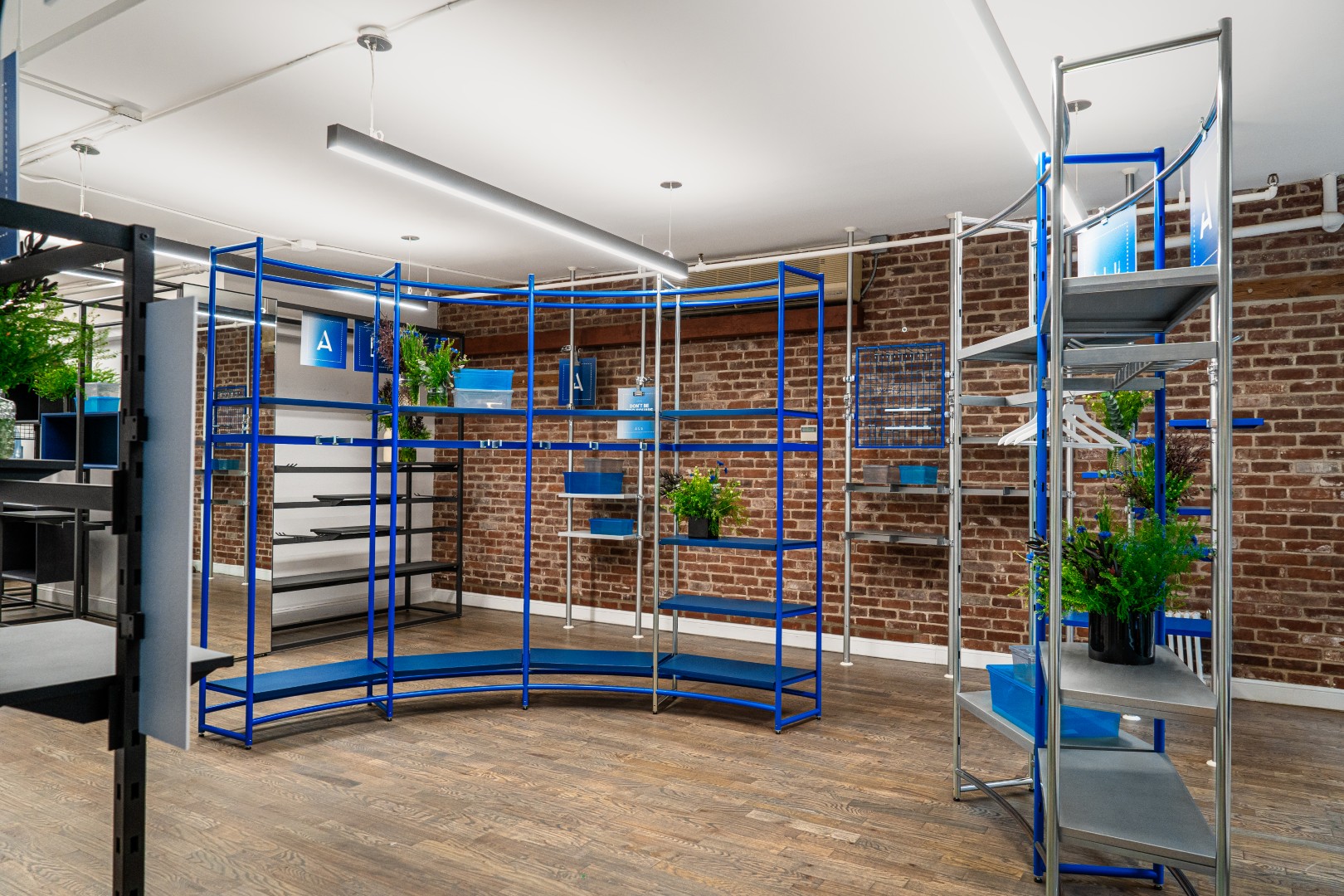 Upon entering the front room, visitors were greeted by a streamlined radial composition of Plot. Showcased in both galvanized steel and classic blue finishes, the display featured new, centered hangbars and trapezoidal shelves composed in both metal and millwork. Silver anodized Autopoles with silver and blue components framed the space, complemented by graphic elements. The mid-space served as the core of the showroom, showcasing the versatility of Tondoquadro in its charcoal finish. The area included a kiosk and illuminated versions, surrounded by millwork: custom inserted platforms, lower cabinets with drawers, full shelves, and suspended open cabinets. In the meeting room, the narrative continued with an Insula fixture in black, charcoal Autopoles, and a reappearance of Plot in galvanized steel and blue, with a variety of accessories. A matching galvanized steel table frame with a rounded blue top anchored the space. Completing the setup were silver anodized Autopoles with a graphic banner and integrated TV monitor.