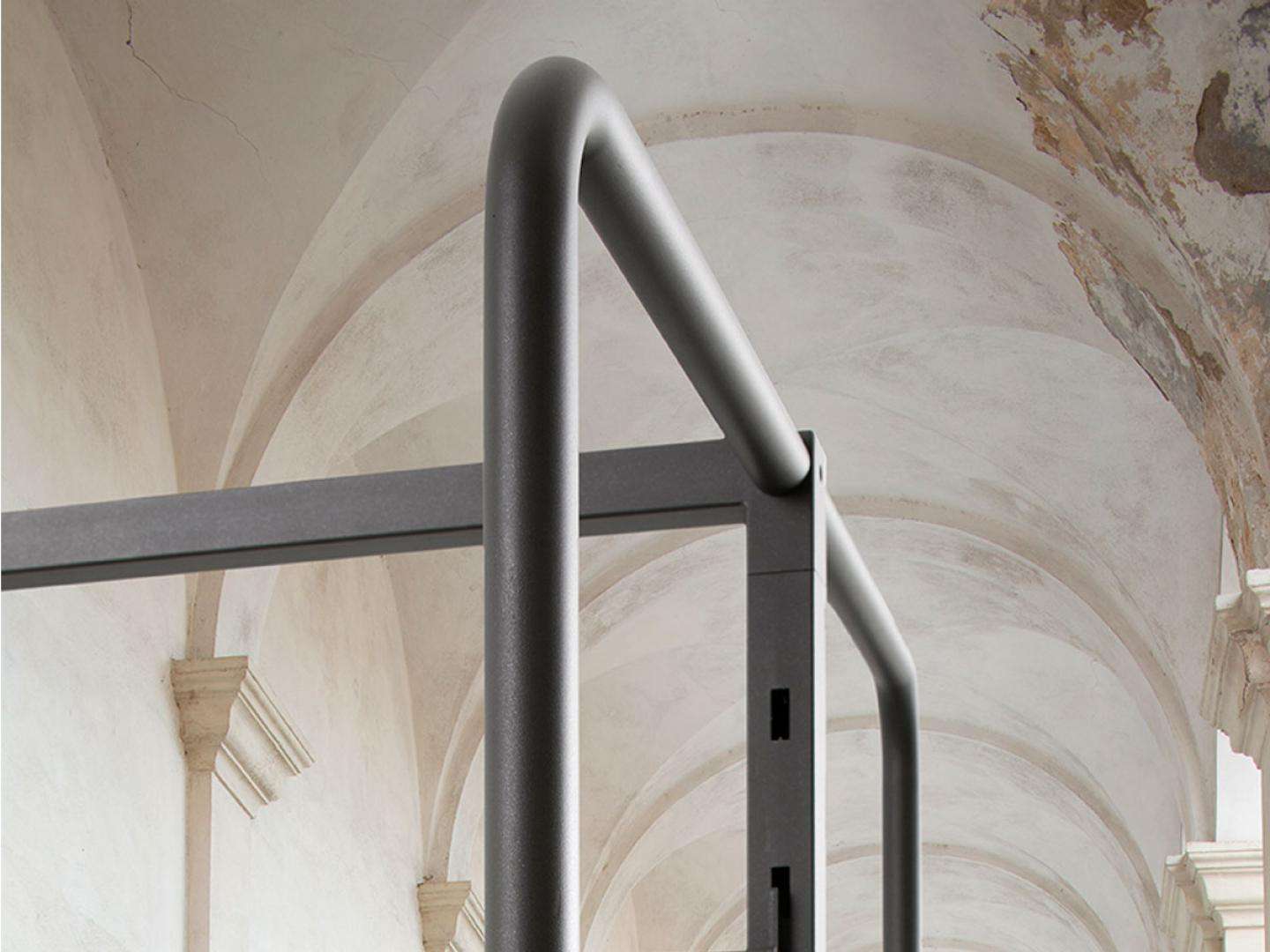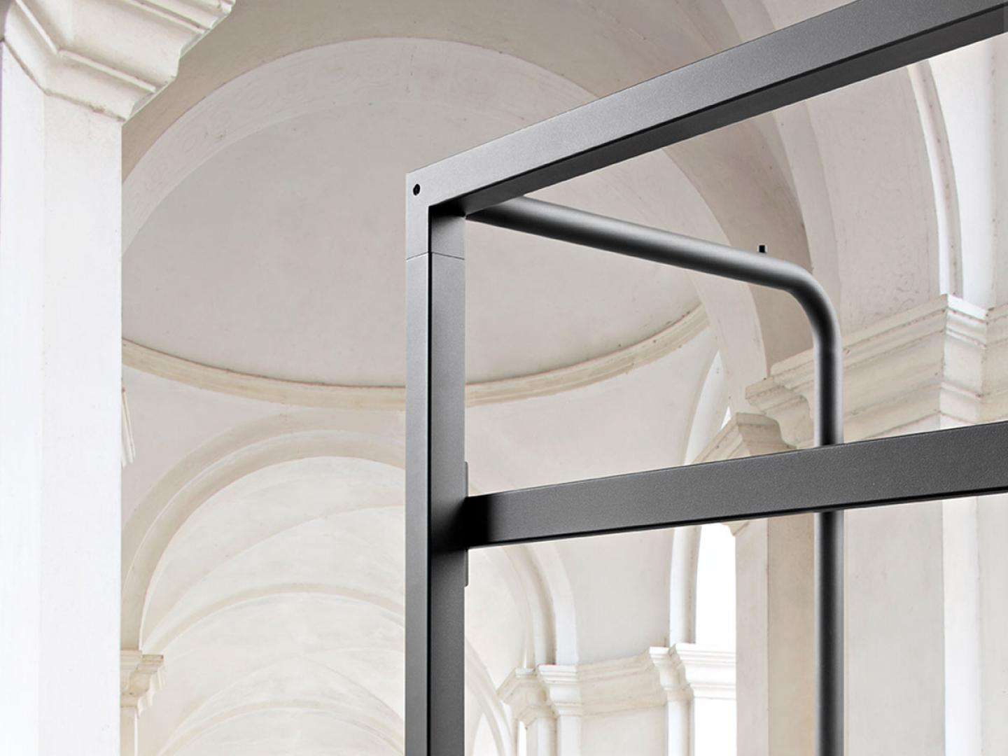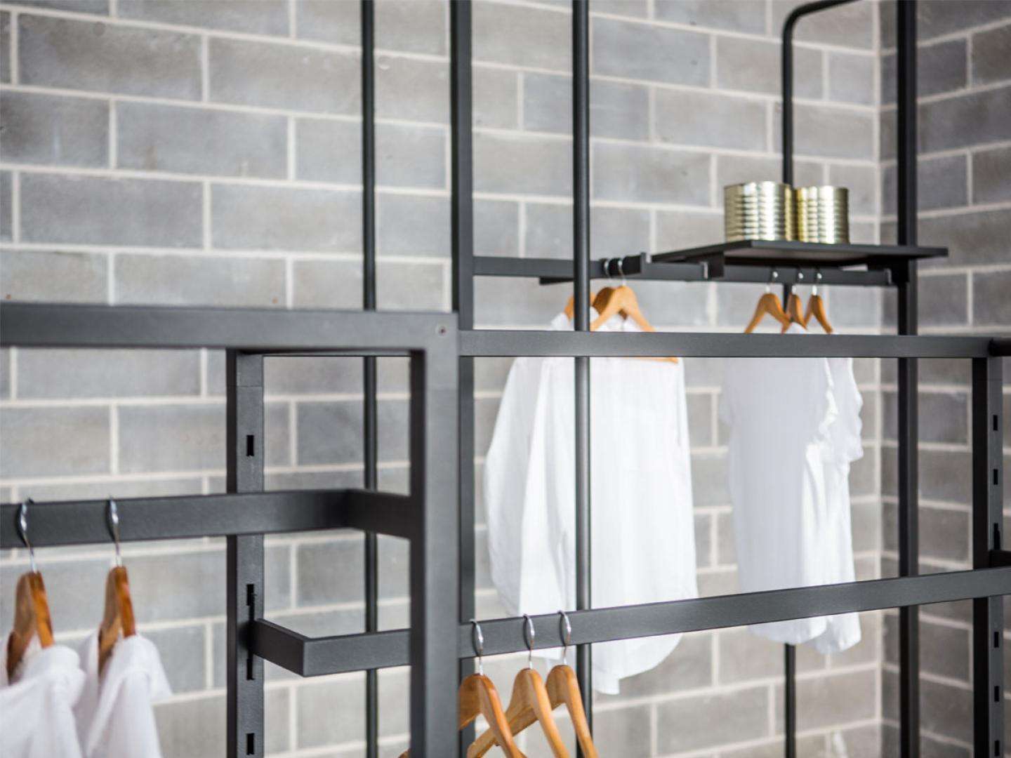 Light and solid, sinuous and geometric, TONDOQUADRO is a system made of round 3 cm / 1 3/16” and square 3,5 cm /1 3/8” steel profiles that combined together create multipurpose display configurations. The aluminum pressure die casted connector allows the slotted square profile to be positioned in four different directions. TONDOQUADRO is the very first ALU system to offer a seamless 183cm / 72” span, boosting hanging and shelving capacity. It can outfit your entire shopping environment or be your kiosk in a multi-branded space. TONDOQUADRO’s accessories transform a static unit into a dynamic display, playing with different layers of merchandise.