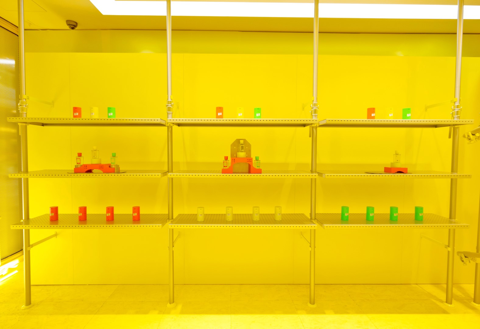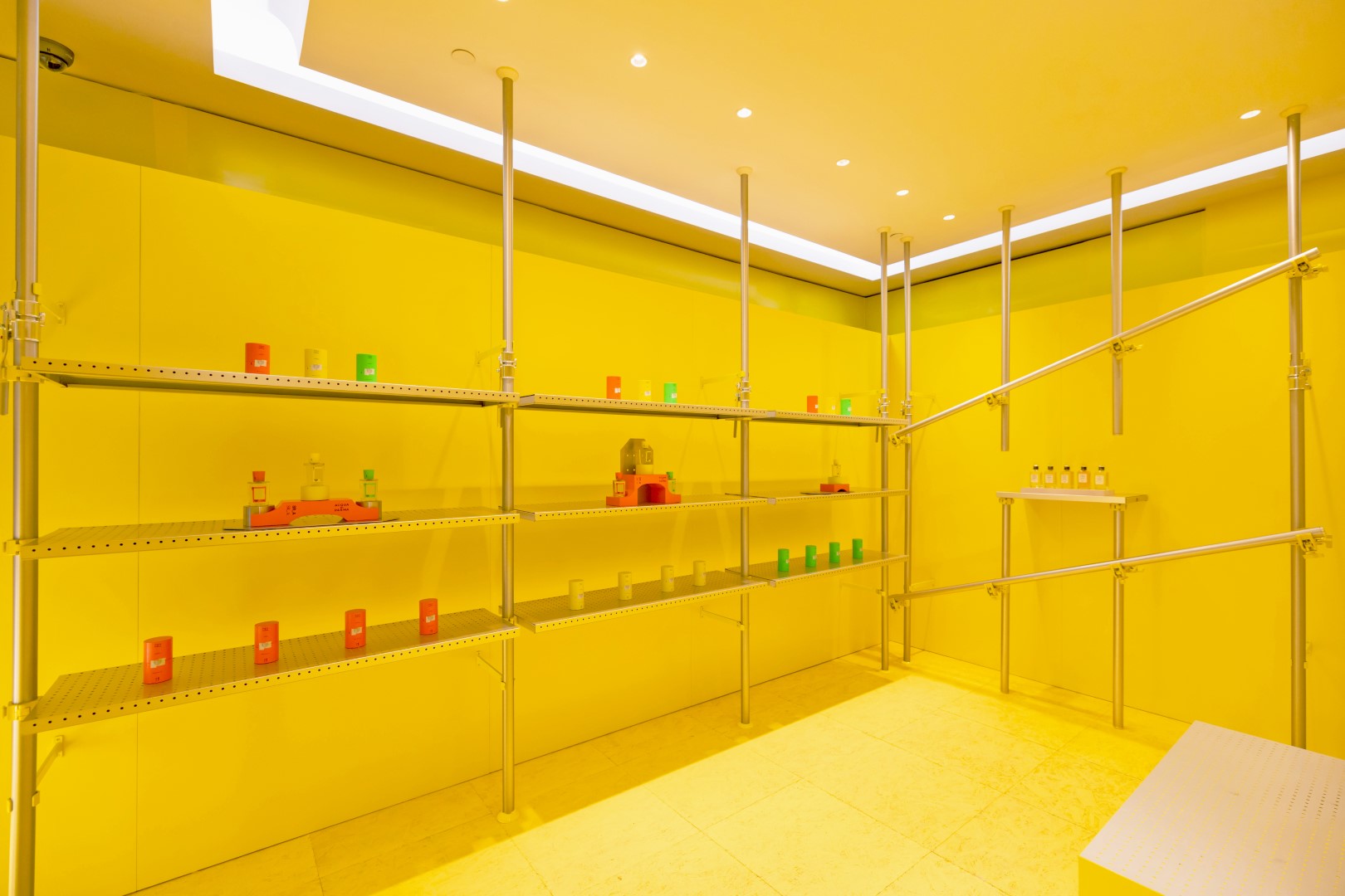The pop up houses the new Colonia limited edition by Samuel Ross on anodized aluminum Autopole with shelves in contrast with walls featuring the brand’s signature yellow shade.