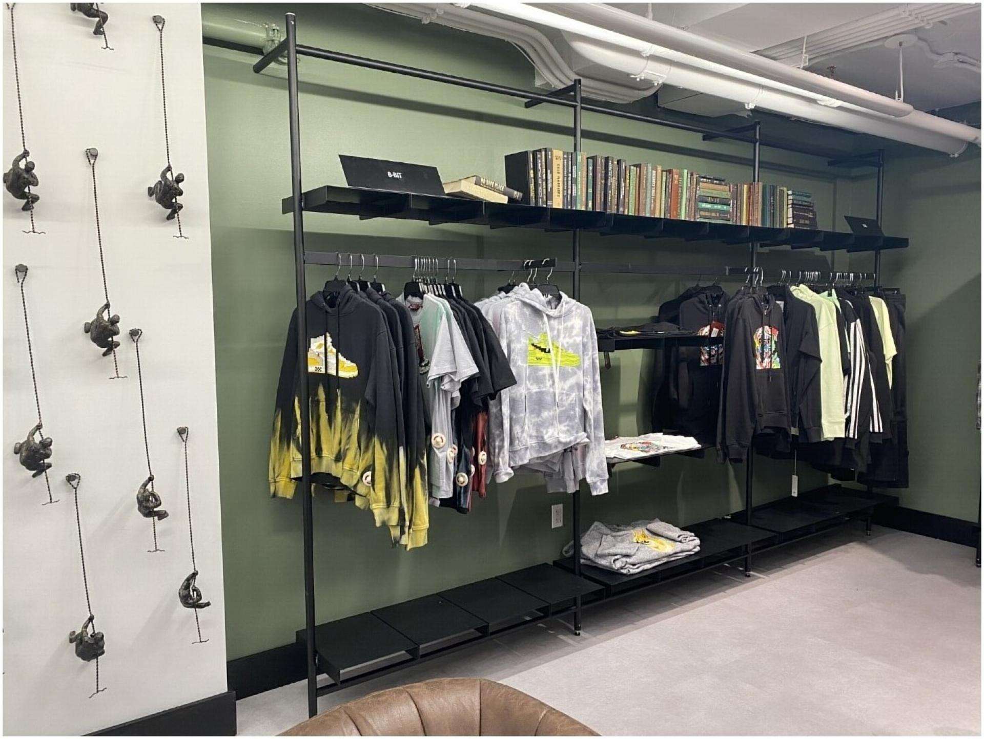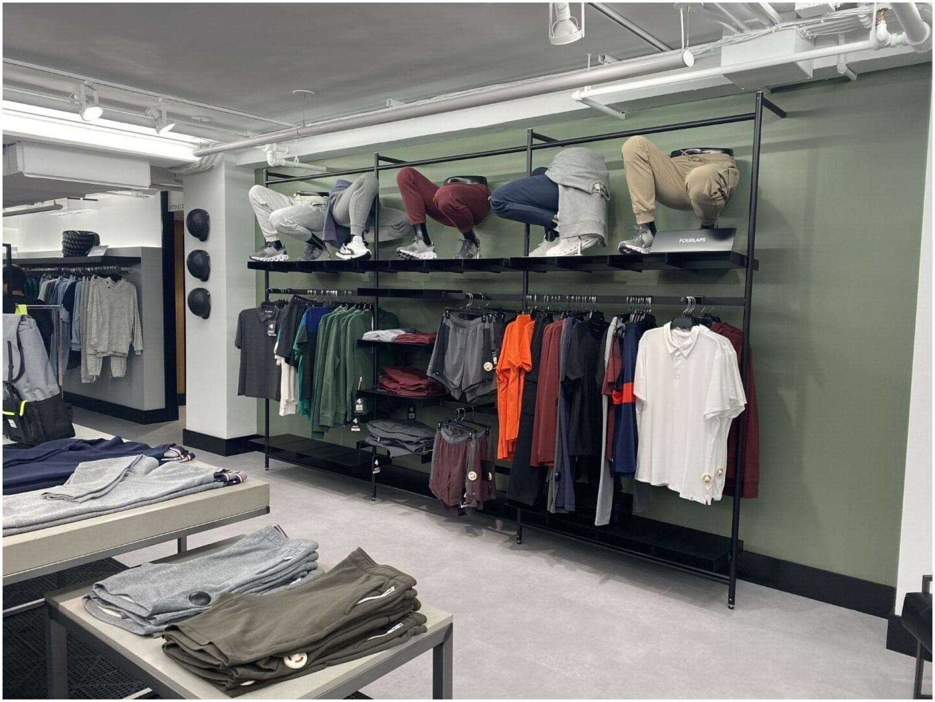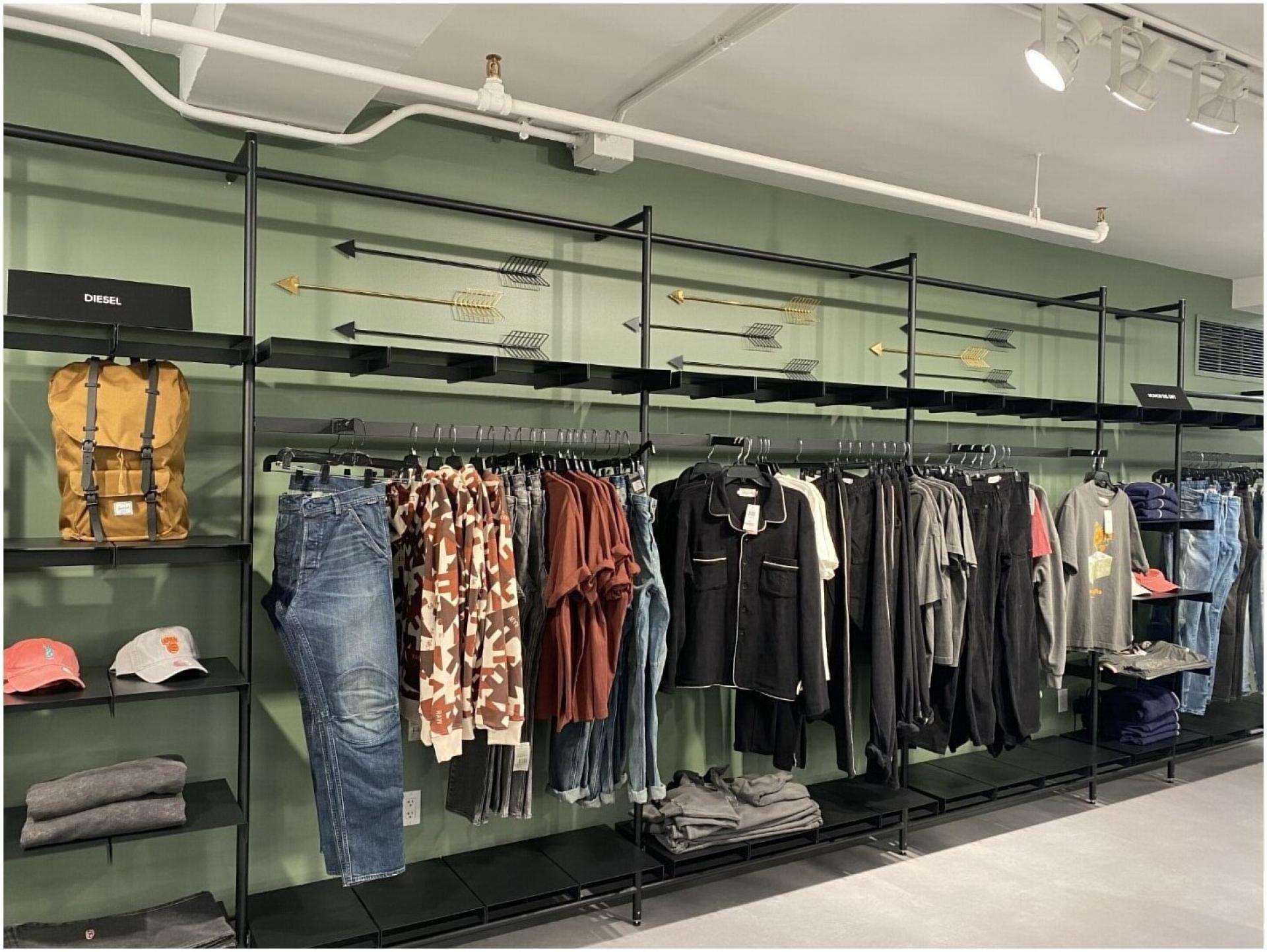 ALU’s Plot system, customized in a black powder finish, can be found along the perimeter walls. Plot provides a modular and flexible solution for the display of the extensive line of merchandise offered. Pants, shirts, and accessories all find a perfect space to be showcased.