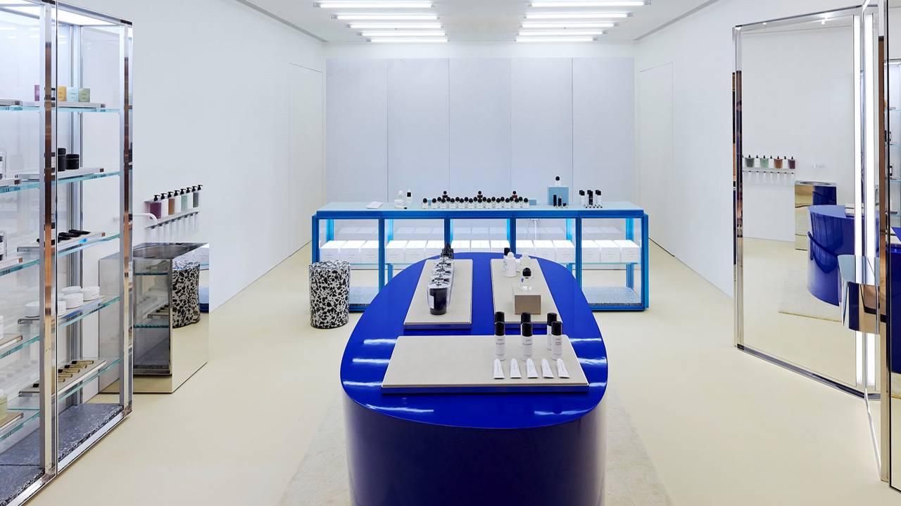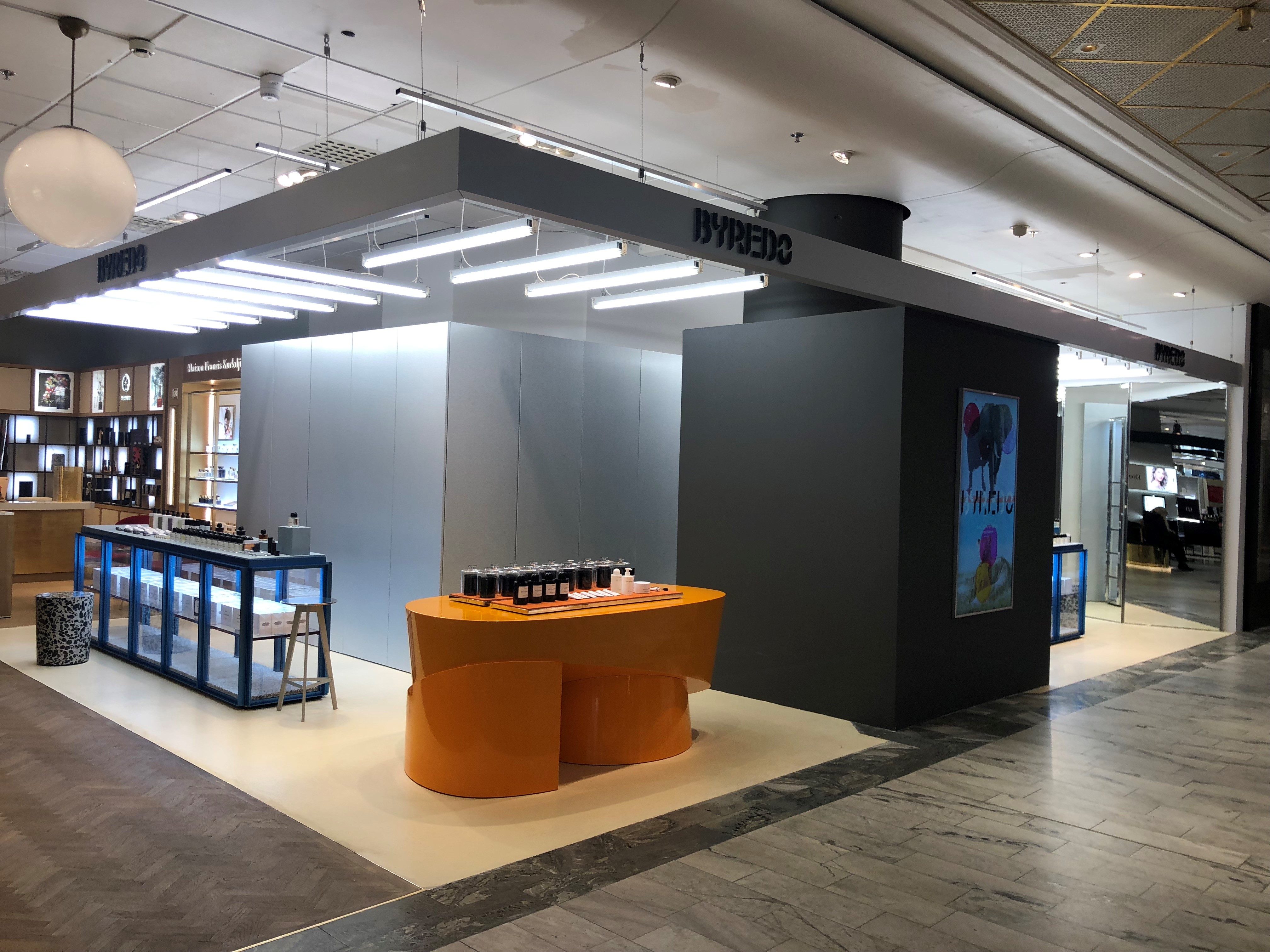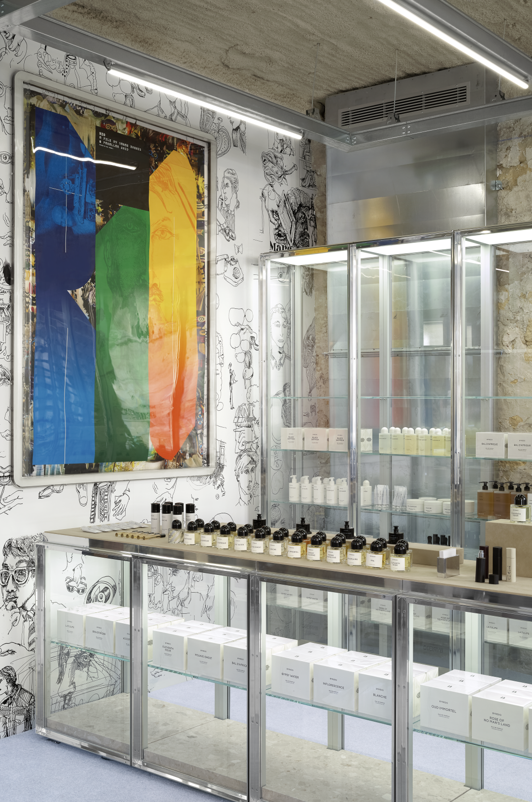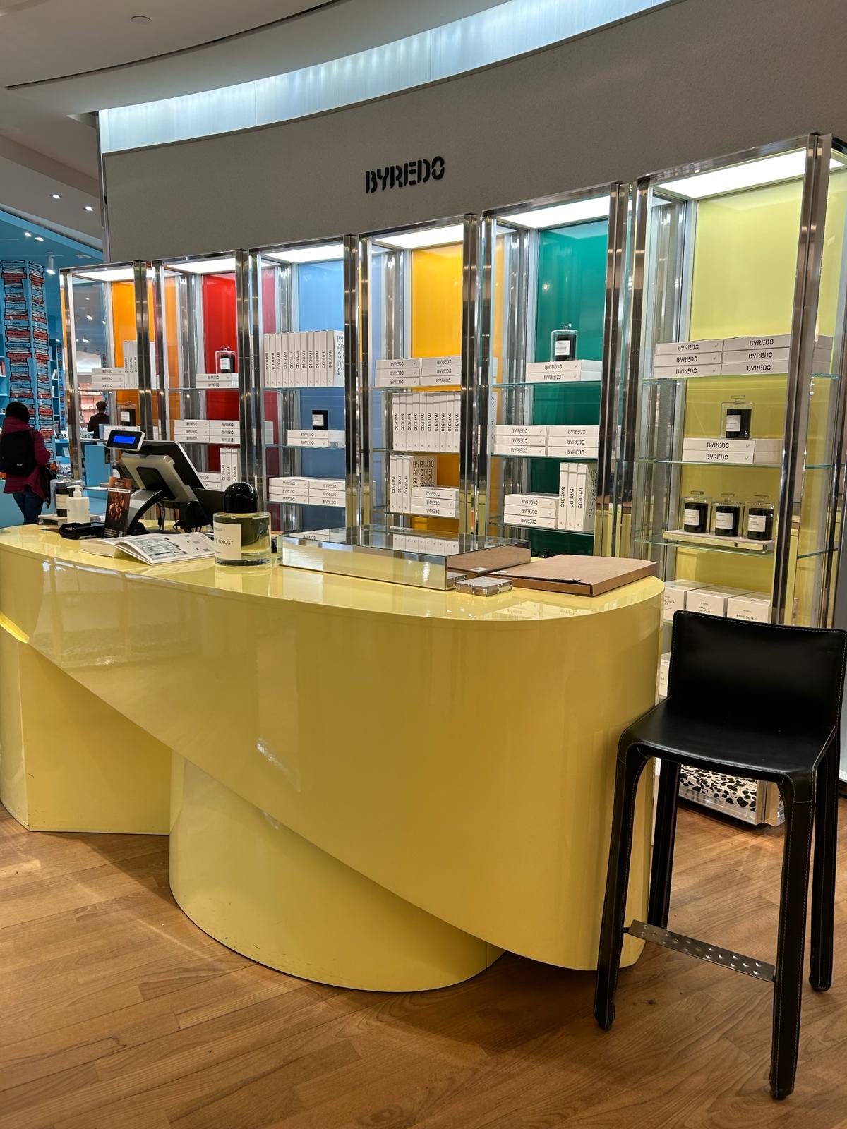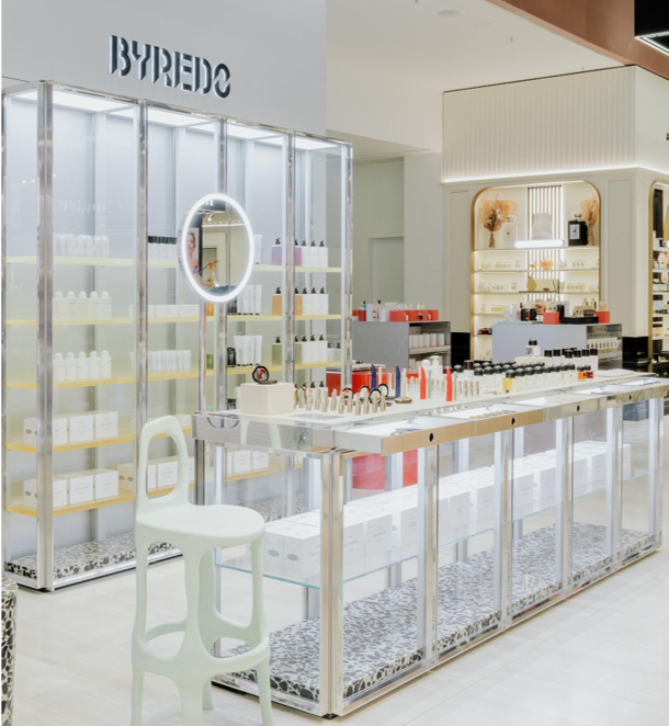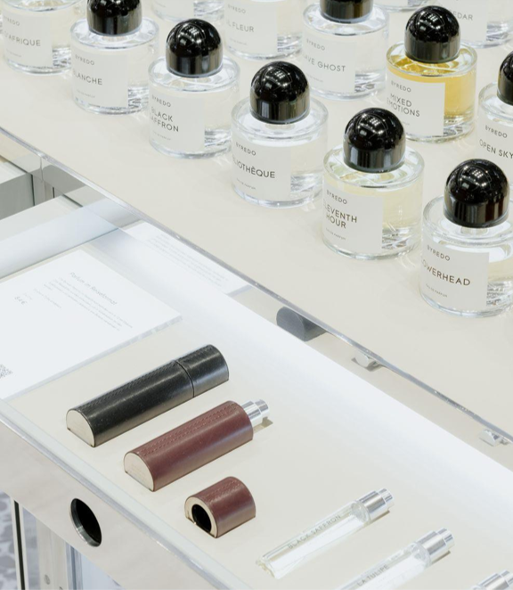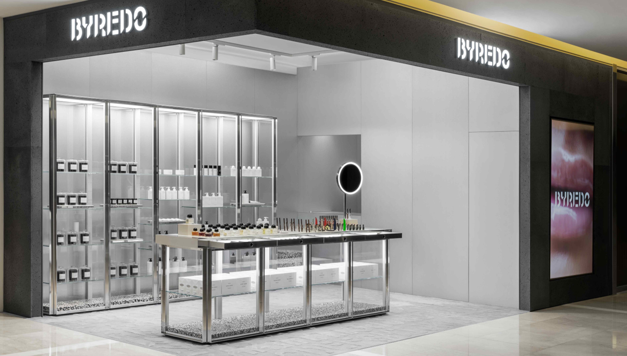 Upon entering the stores, shoppers are welcomed by aluminum cabinets, counters, and makeup display laden with merchandise, inviting exploration of Byredo’s full range of perfumes, home fragrances, makeup, and body care products.