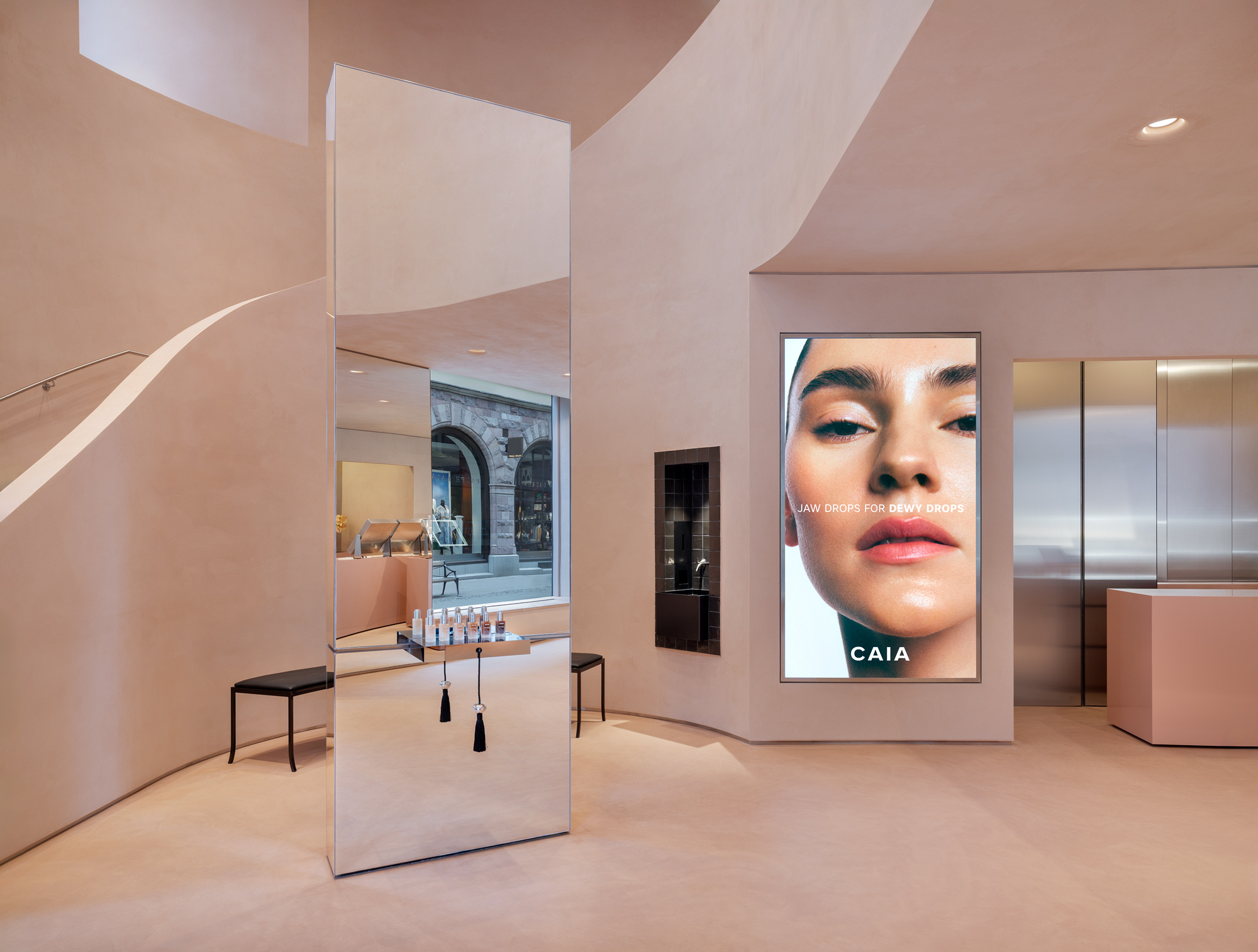 The ground floor—“The Beauty Area”—caters to quick, self‑guided shopping, showcasing CAIA’s complete product range. Above, “The Glow Floor” offers a more secluded atmosphere for personalized Beauty Sessions and a dedicated room for rotating product exhibitions.
