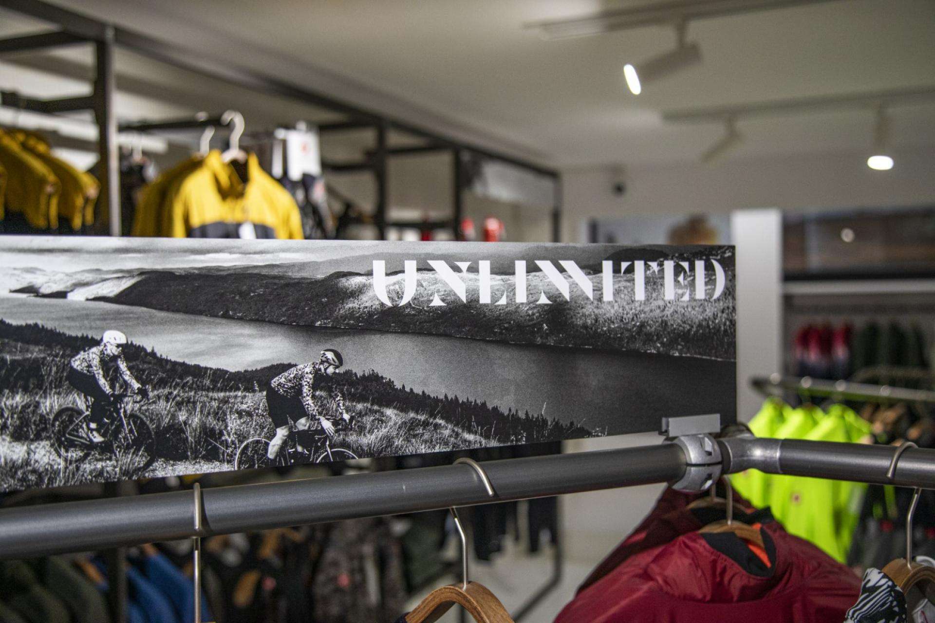 ALU Foldaway, Flex and vertical units and consoles display cycling shorts, t-shirts, jerseys, windproof membranes, and garments such as the famous Gabba, which revolutionized foul-weather cycling apparel.