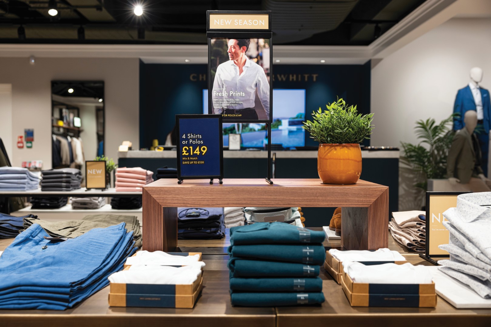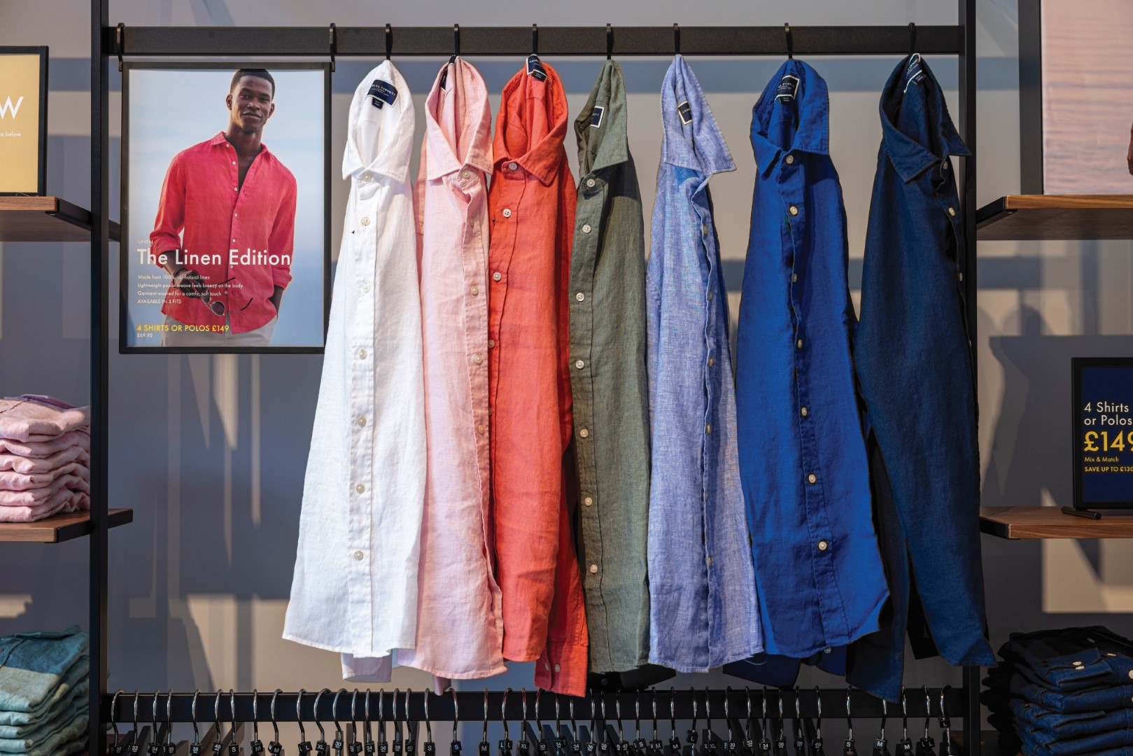 Vertical wall-mounted units provide a stylish and efficient solution for displaying the brand’s signature tailored shirts, plush knitwear, and chinos.