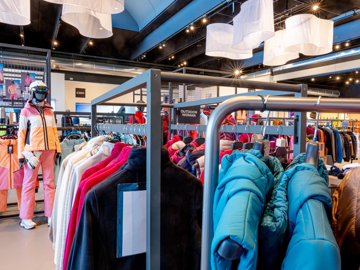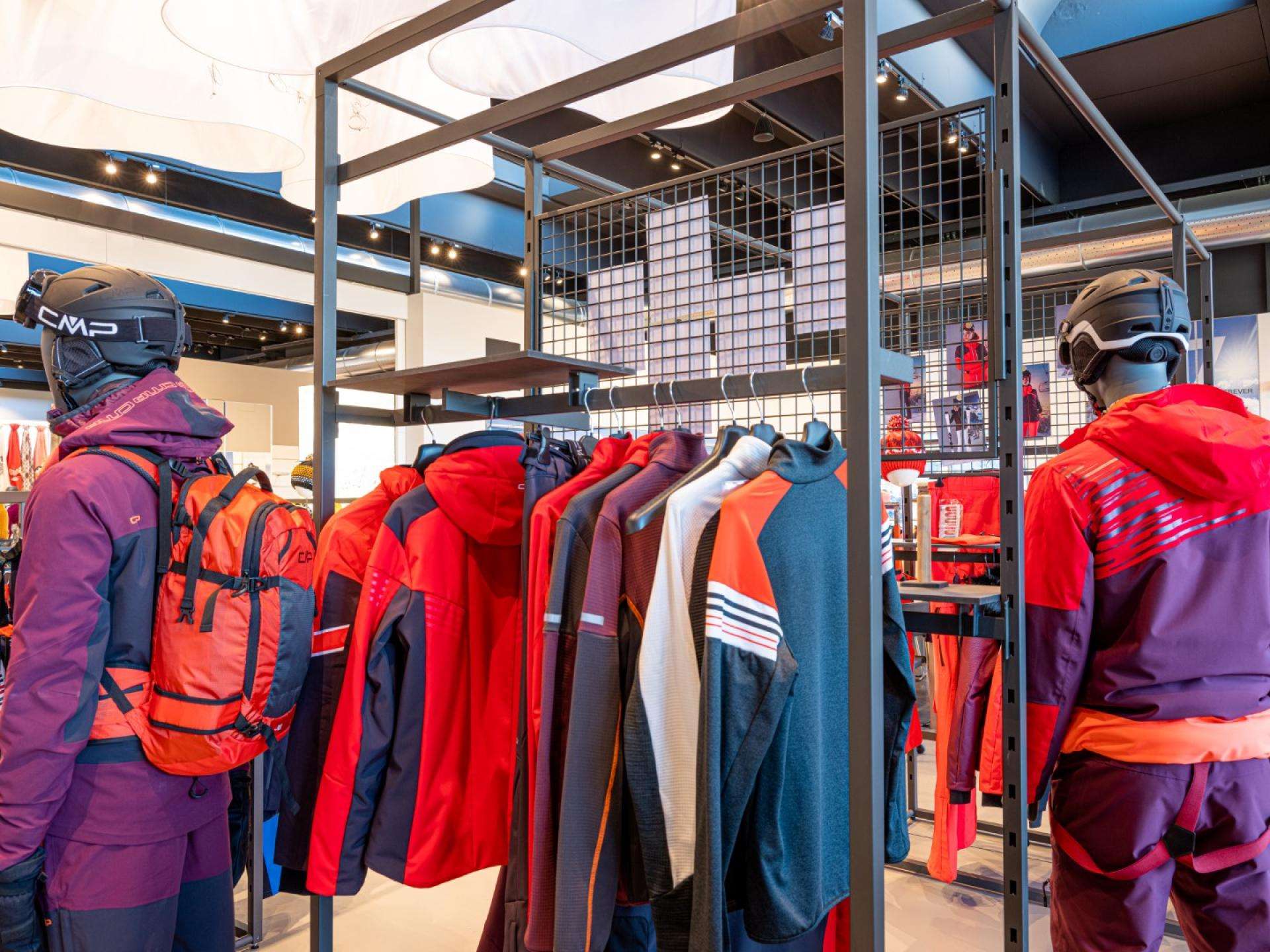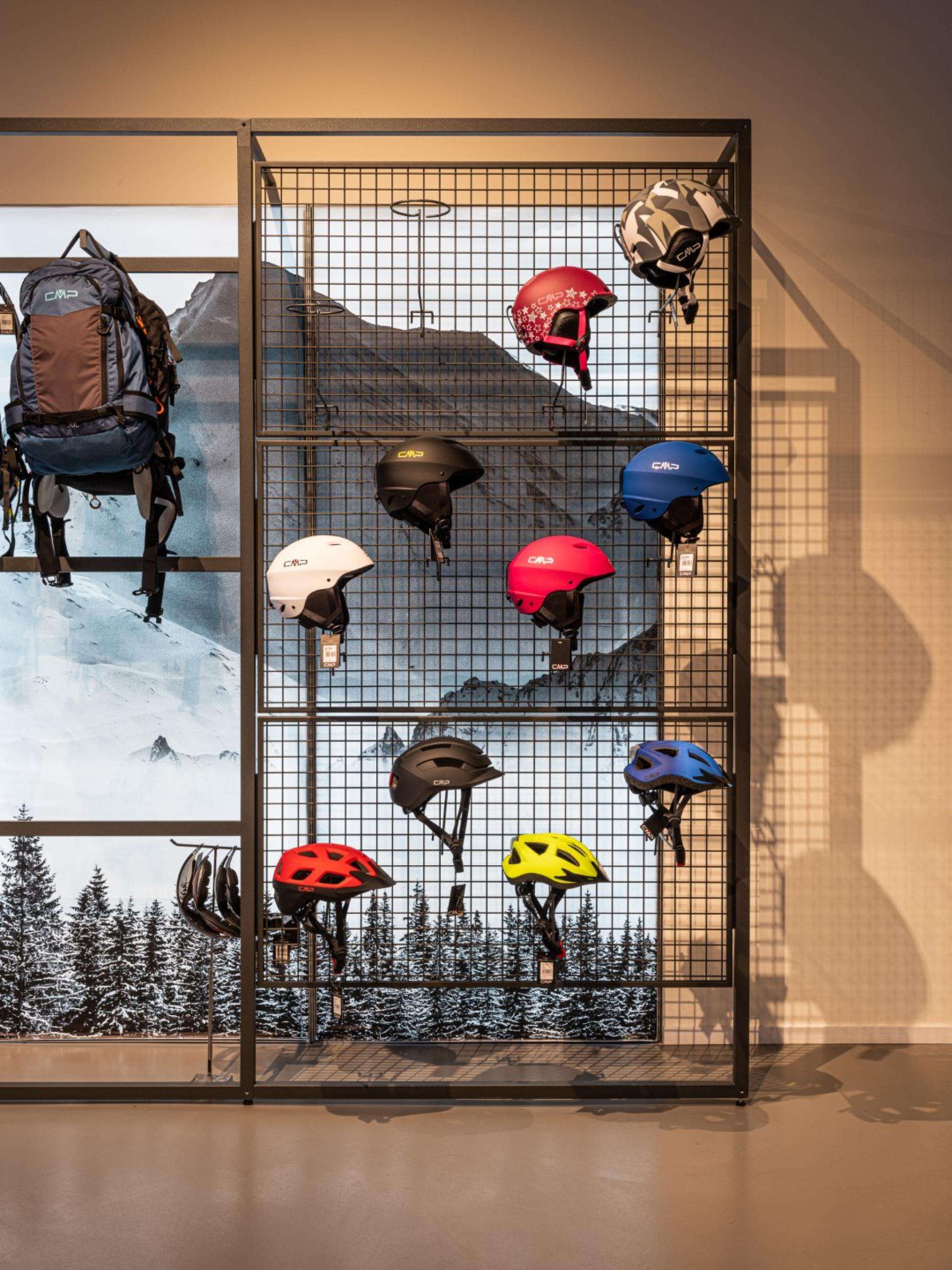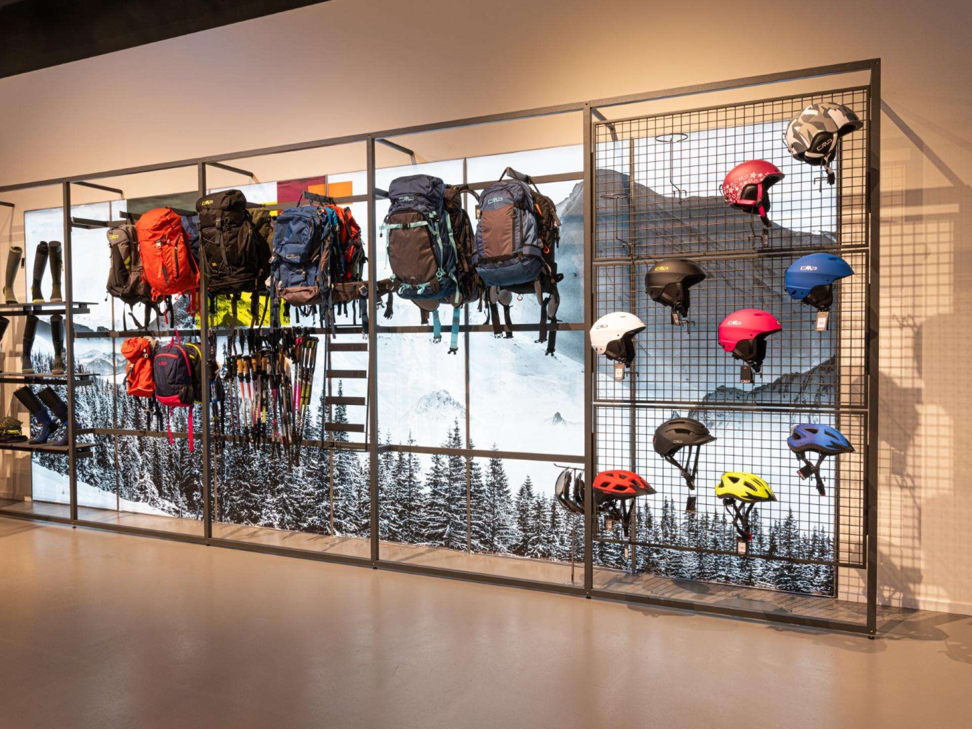 TondoQuadro freestanding kiosks, prisma units and wall frames have been used throughout the space to display jackets, accessories, footwear, helmets, and backpacks.
