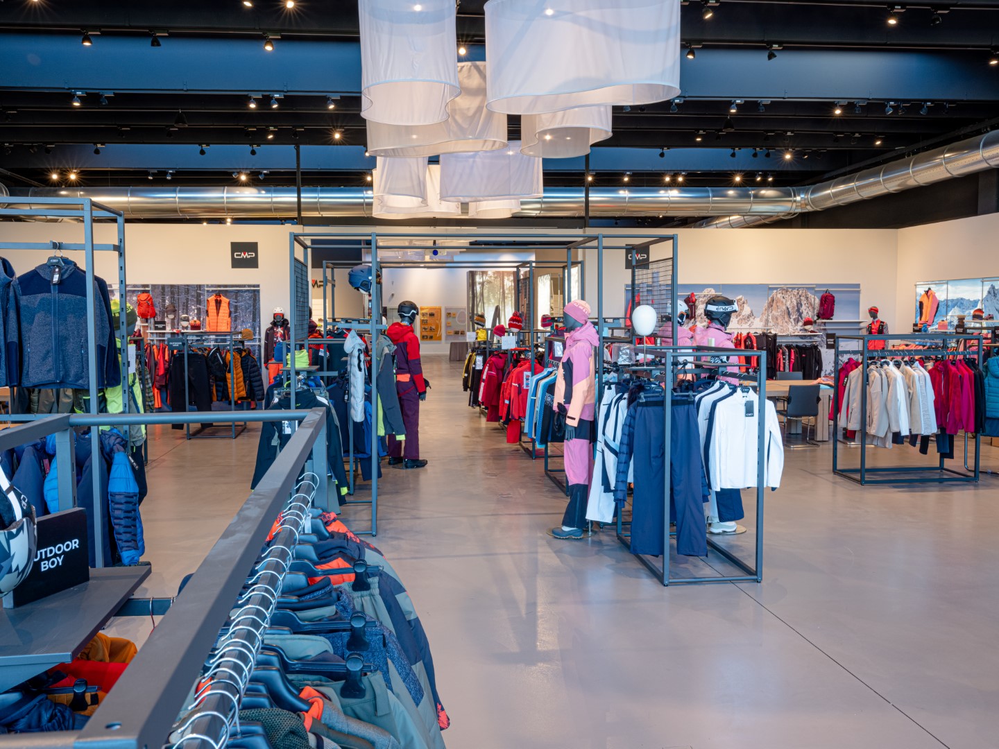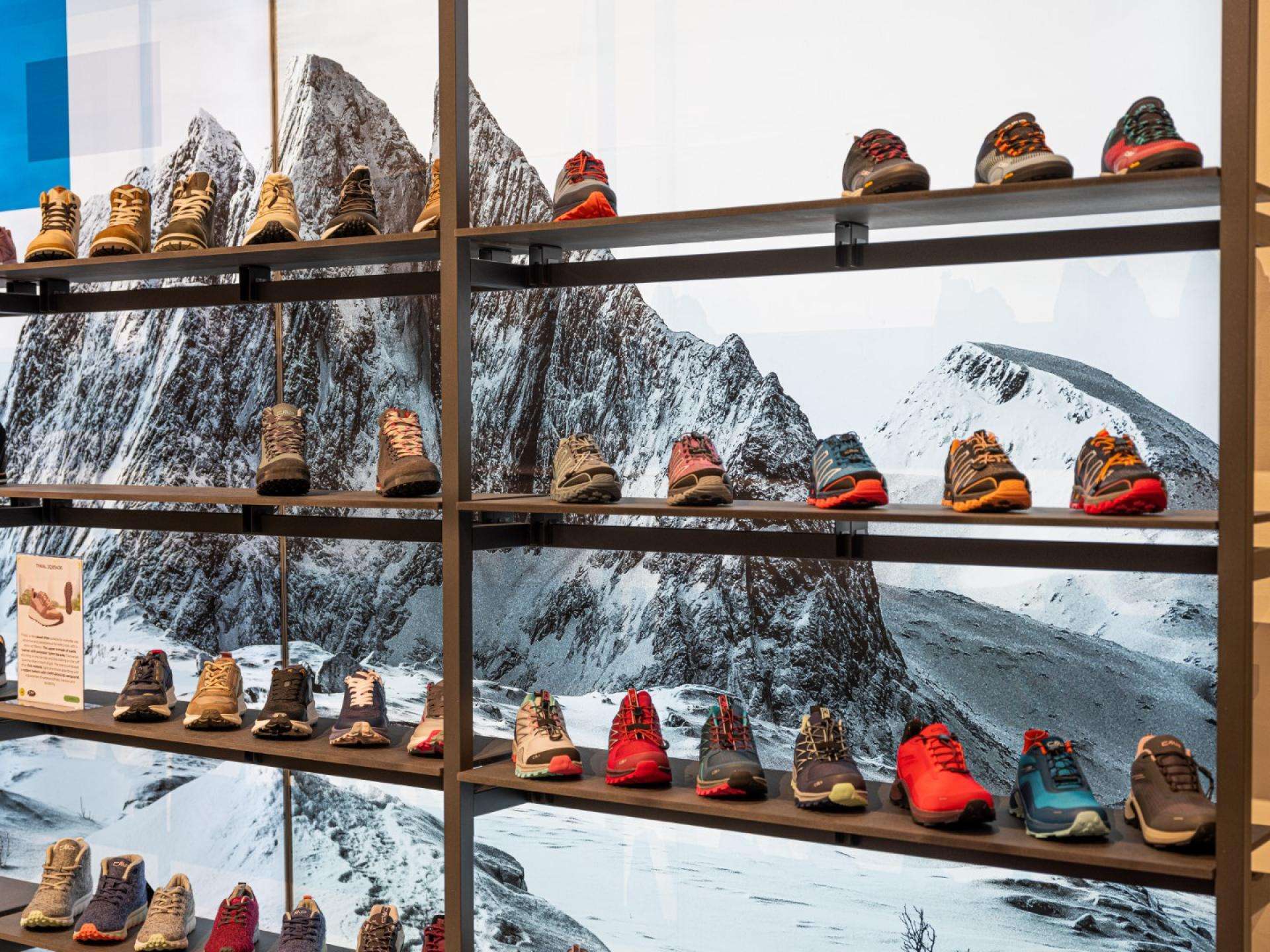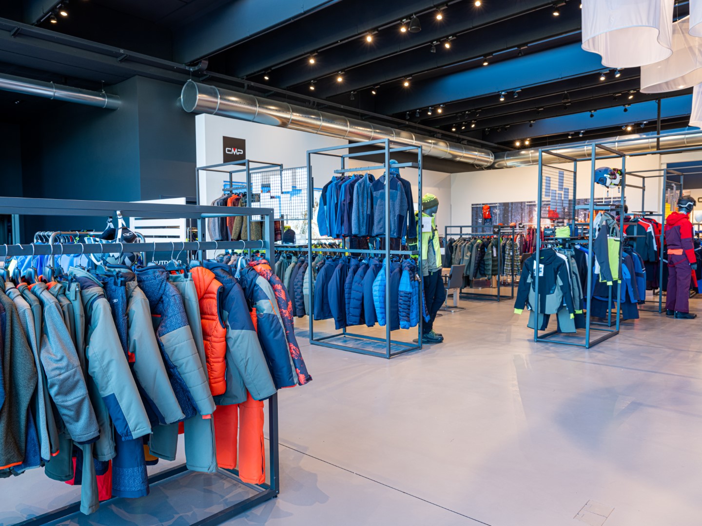 TondoQuadro freestanding kiosks, prisma units and wall frames have been used throughout the space to display jackets, accessories, footwear, helmets, and backpacks.