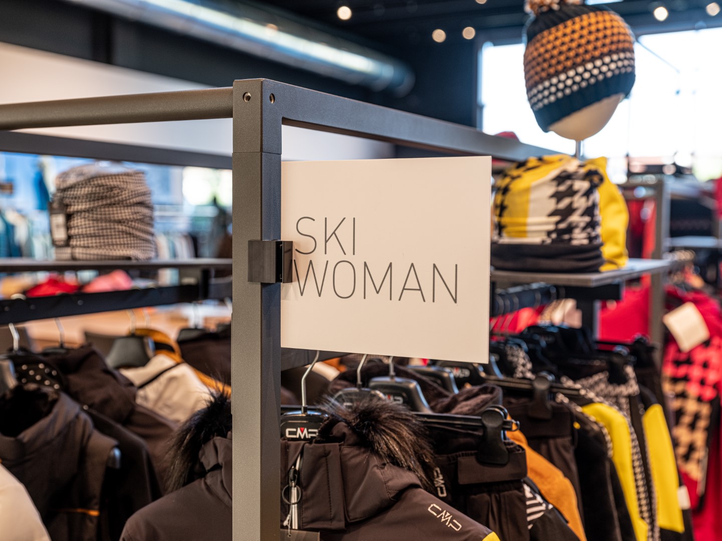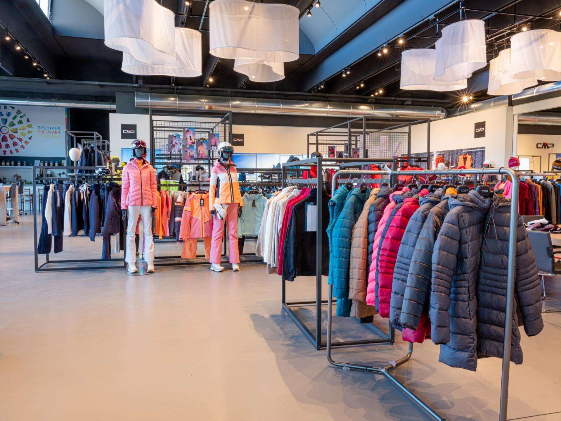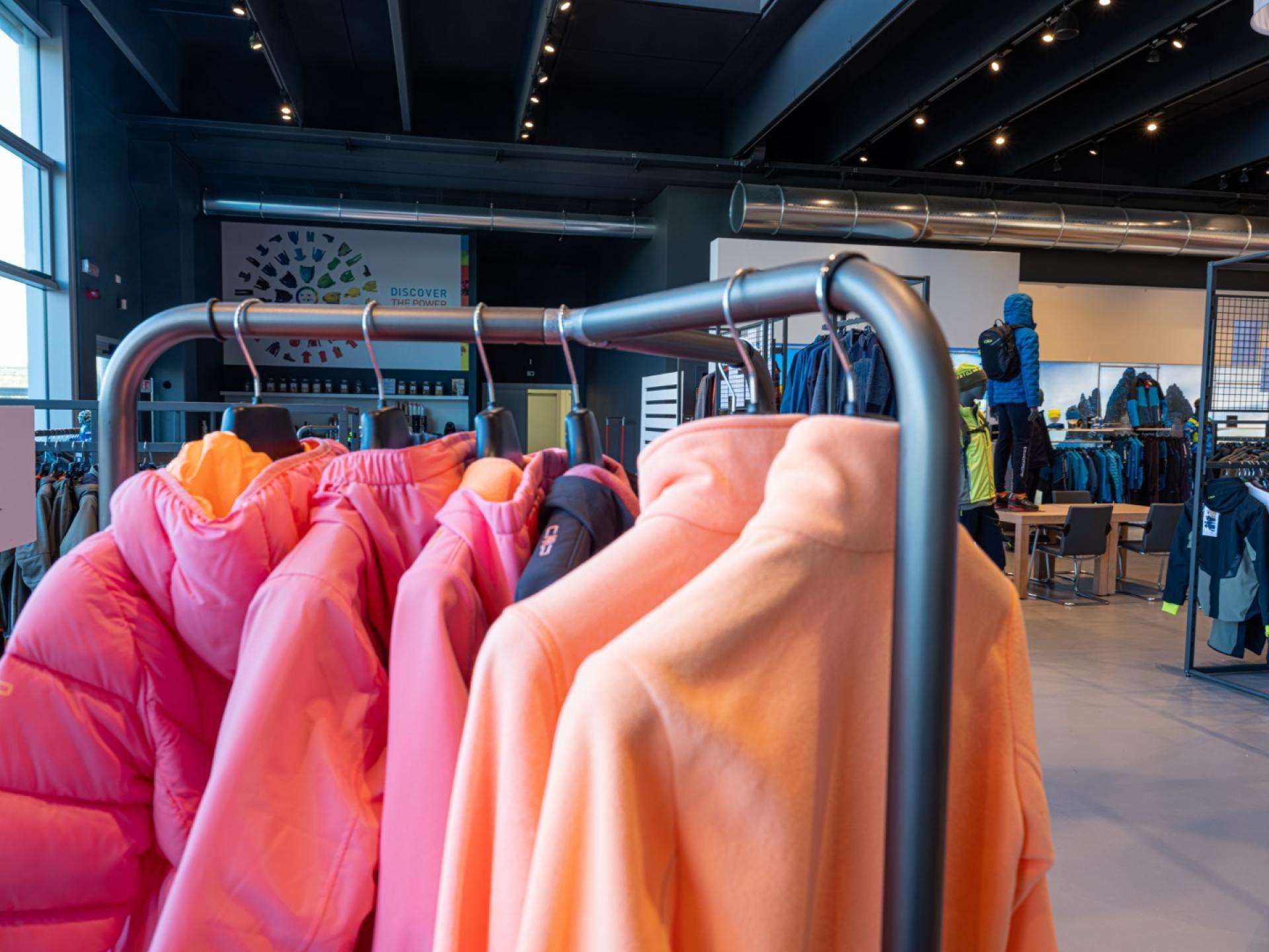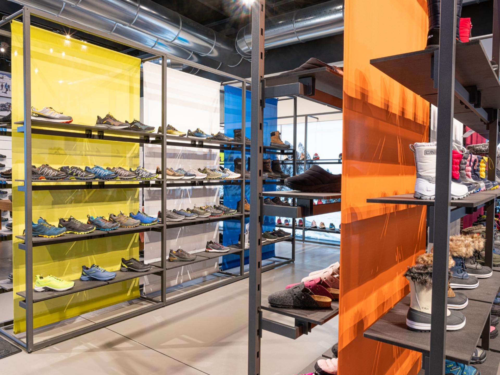TondoQuadro freestanding kiosks, prisma units and wall frames have been used throughout the space to display jackets, accessories, footwear, helmets, and backpacks.