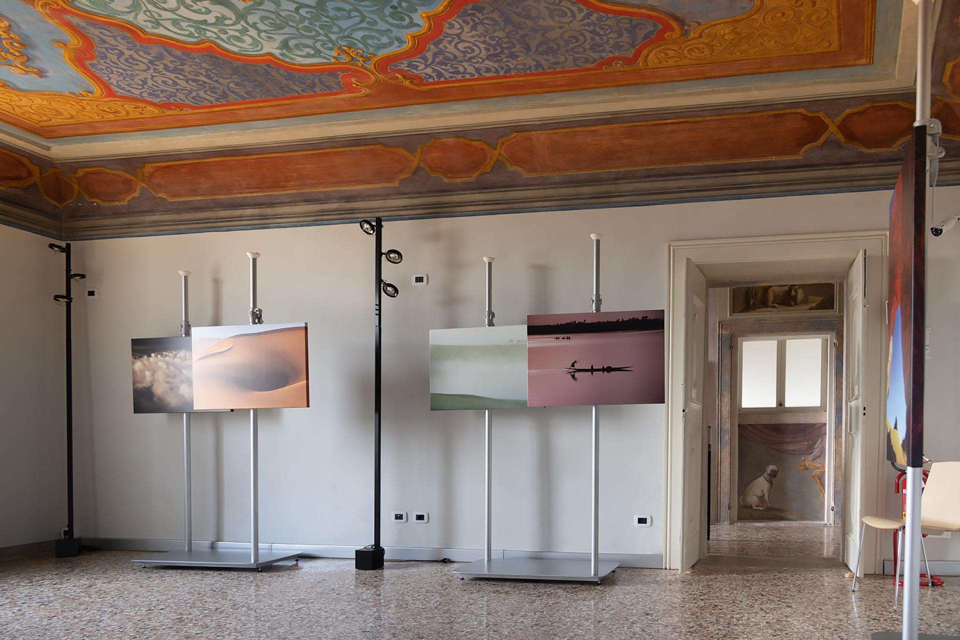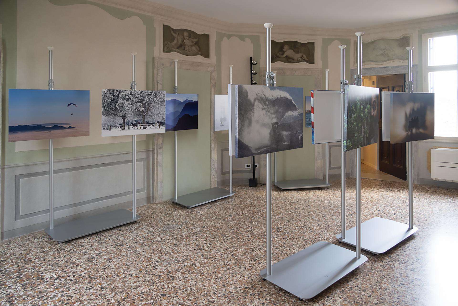 Coming from the world of photography and cinema, Autopole has been chosen to display the artworks of the photographer Cesare Gerolimetto. Inaugurated on May the 13th at Palazzo Sturm in Bassano del Grappa, the exhibition “Cesare Gerolimetto. Viaggio sentimentale” is a tribute to the photographer’s career. To outline the exhibition itinerary, the freestanding Autopole system has been used to exhibit the 52 photographs. The flexibility of the fixtures allows for endless display solutions to adapt to different needs and surfaces like the irregular floors and the frescoed ceilings of the historic building. The minimal design of the structure in white finish and the pale colors of the rooms’ walls make the photographs to stand out, guaranteeing an immersive 360° experience to all visitors.