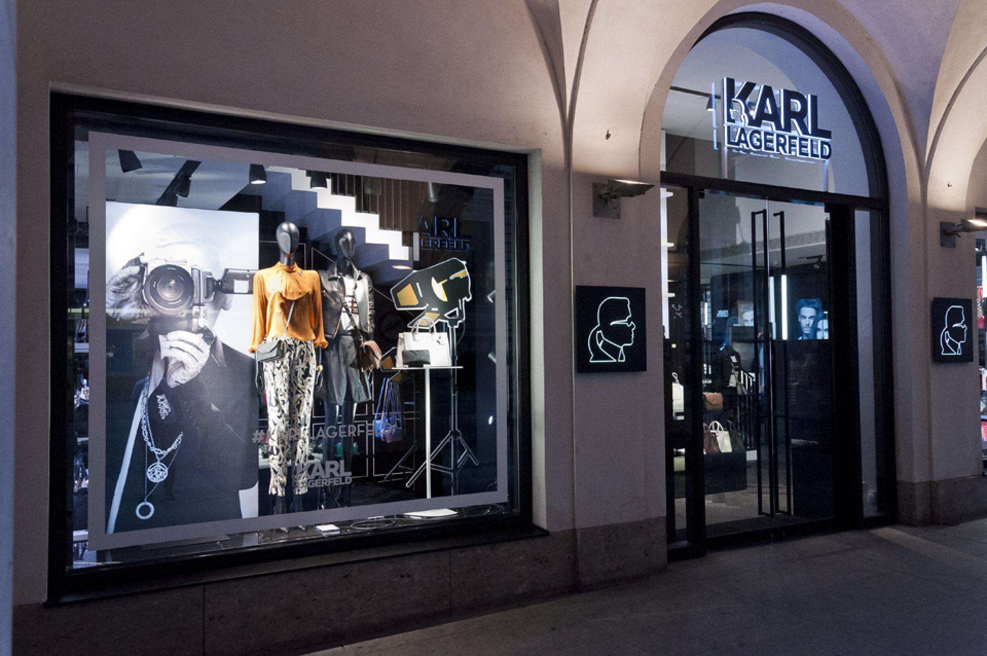 An individual LIGHTBOARD system puts the black and white image of Karl on full display, creating depth in the window and directing the passerby’s focus to the window’s center.