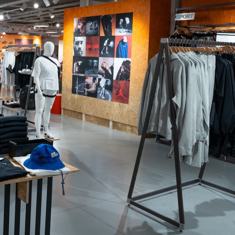 Slash vertical wall mounted units equipped with signage accessories emphasized the different sections of the store, from the kids’ area to the sport zone. Crossbars and faceouts provided a sleek solution for hanging t-shirts and shorts, while integrated shelves showcased folded apparel and shoes, ensuring a clean and organized presentation. Slash freestanding flex units, strategically placed throughout the store, offered flexibility, enabling the hanging of exclusive apparel in various configurations. The clear painted raw steel finish added an industrial, modern touch that complemented the bold orange tones dominating the space.