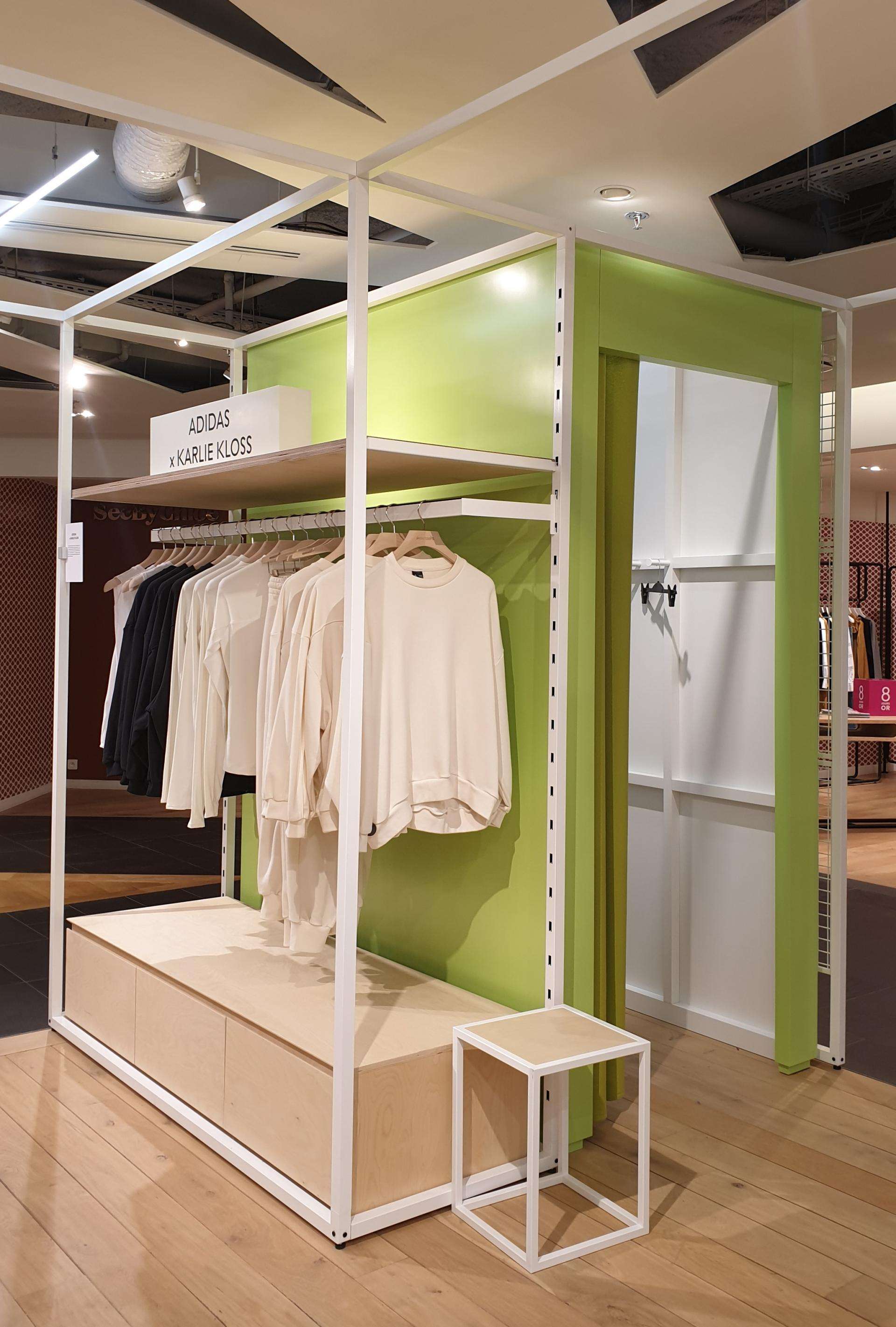 In this “athleisure” universe dedicated to sportwear and leisure, the green and yellow tones and the parquet floor mix with a wide range of colorful clothes displayed on ALU’s Quadro Quadro system in white. The freestanding kiosks outfit the entire multi-branded environment creating several spaces within the space. Multiple accessories are also displayed on ALU’s birch plywood shelves and cabinets throughout the store.
