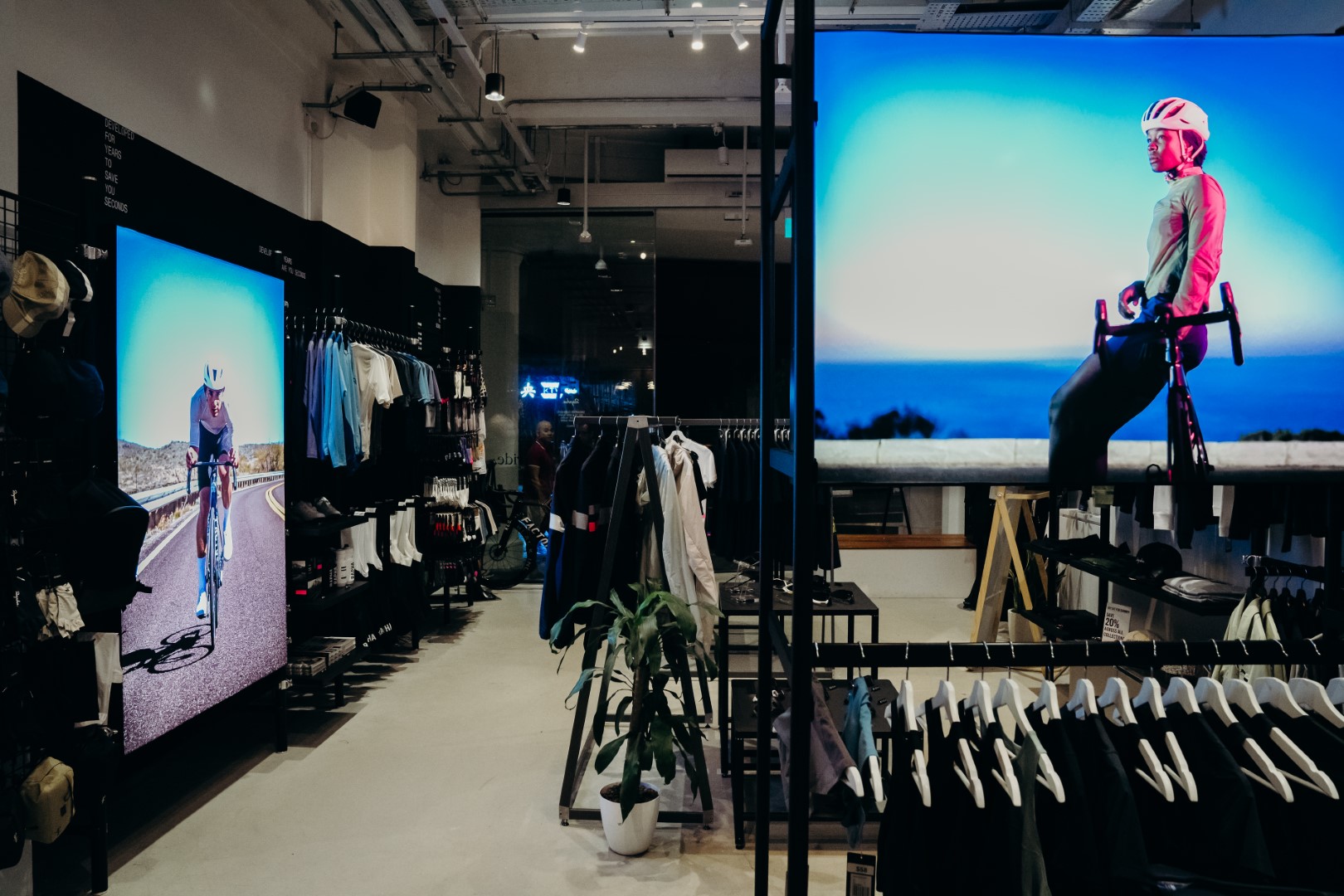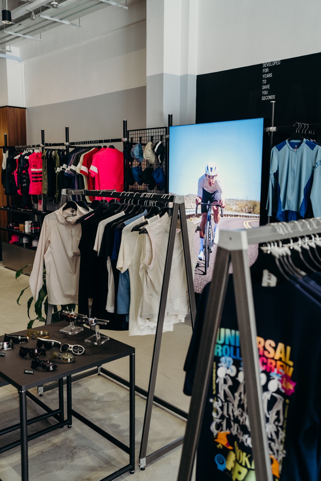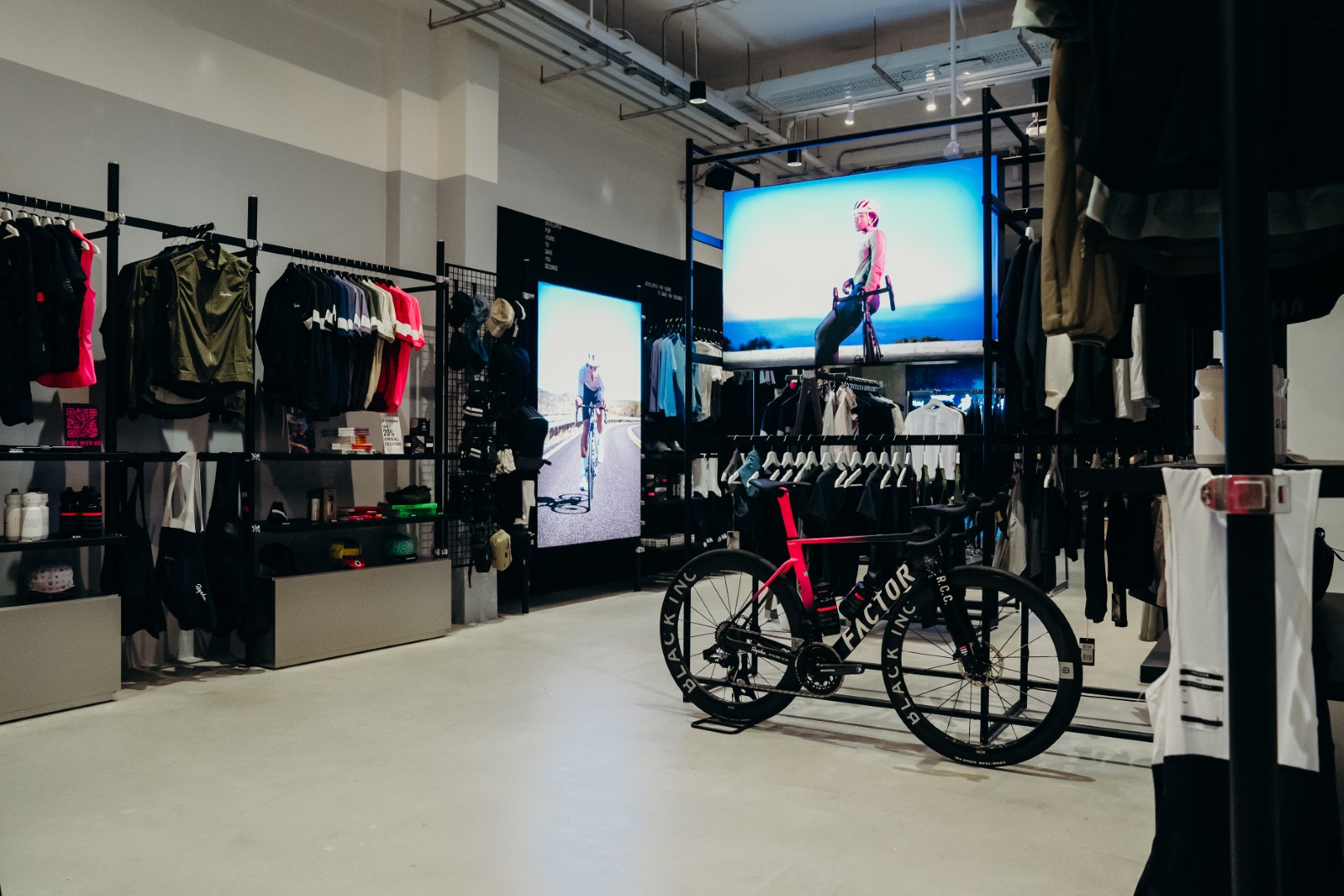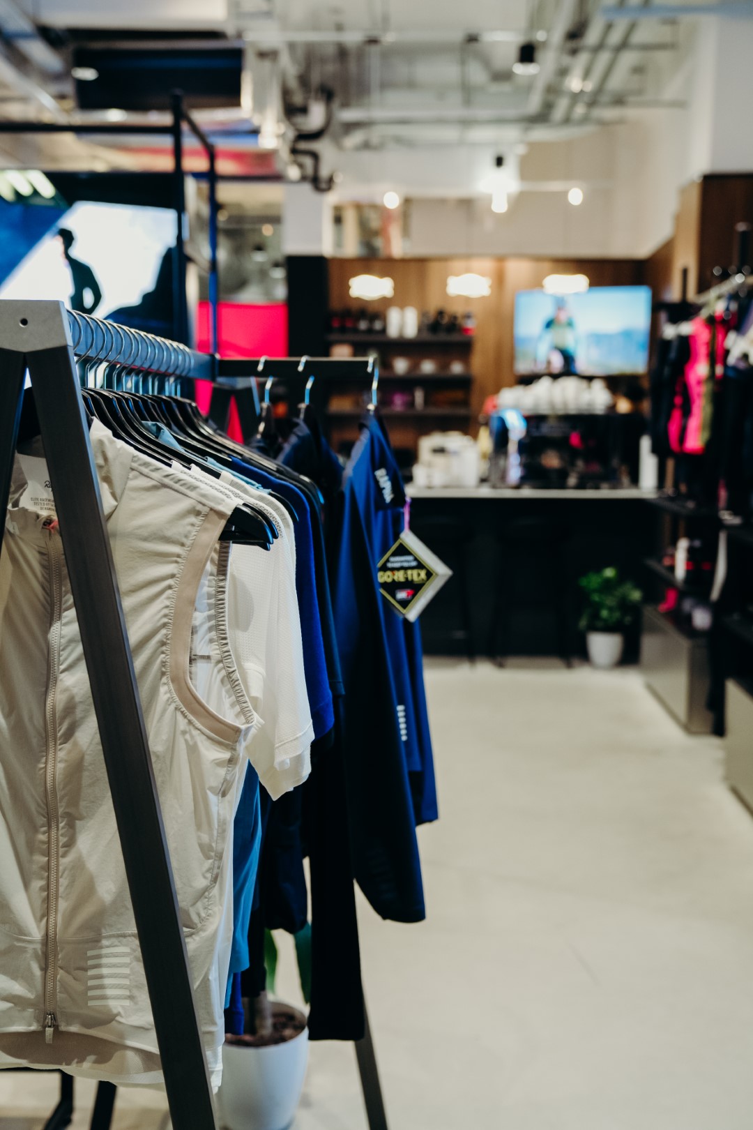 The interior of the Clubhouse is a welcoming space for both enthusiasts and casual riders. ALU’s display systems, including Slash, Plot, and custom poles with Autopole’s accessories in black, provide a stylish backdrop for showcasing Rapha’s world-class cycling clothing.