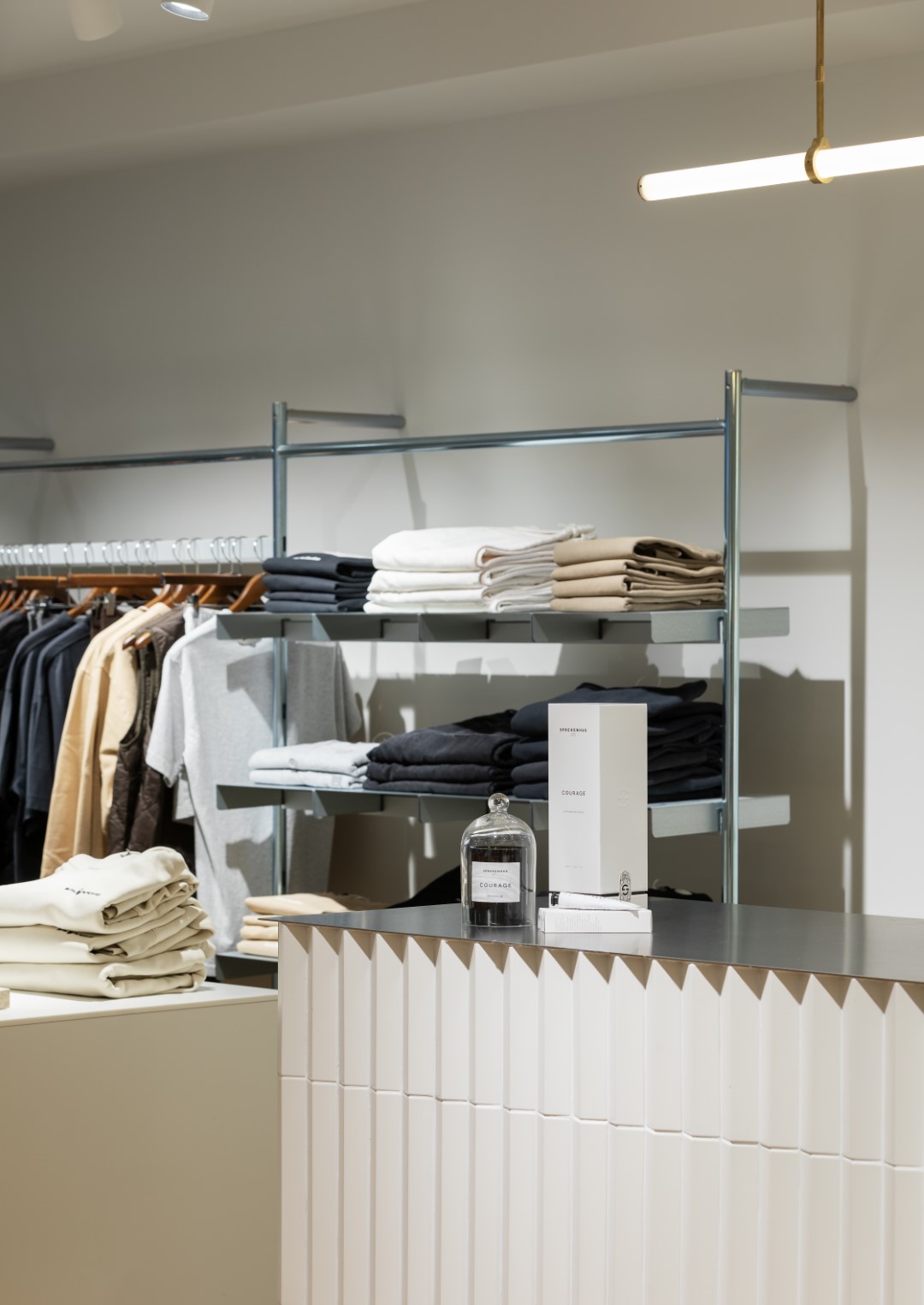 The new interior features Plot wall-mounted units in cold galvanized steel, equipped with shelves for folded apparel and crossbars to display hanging garments.