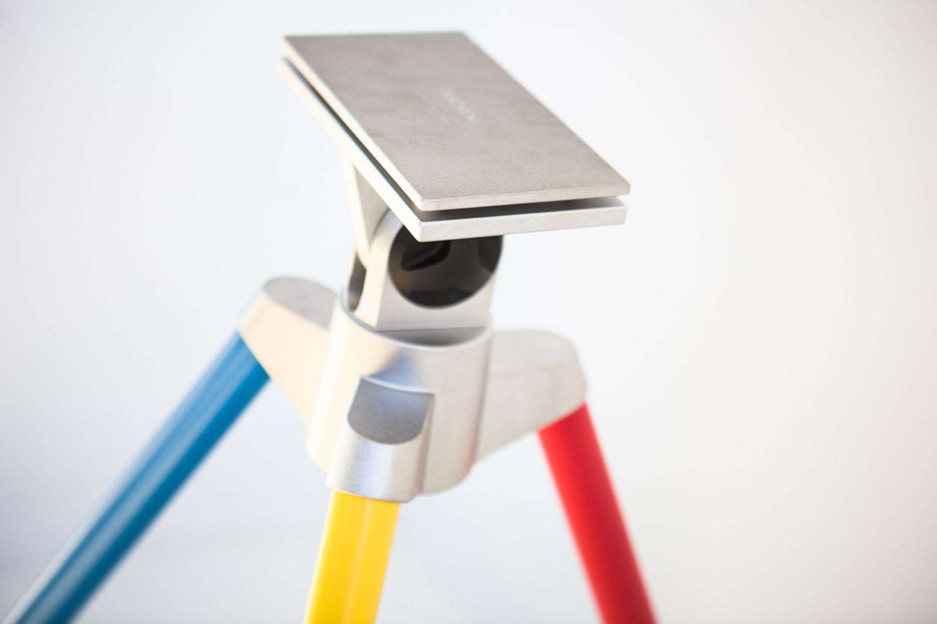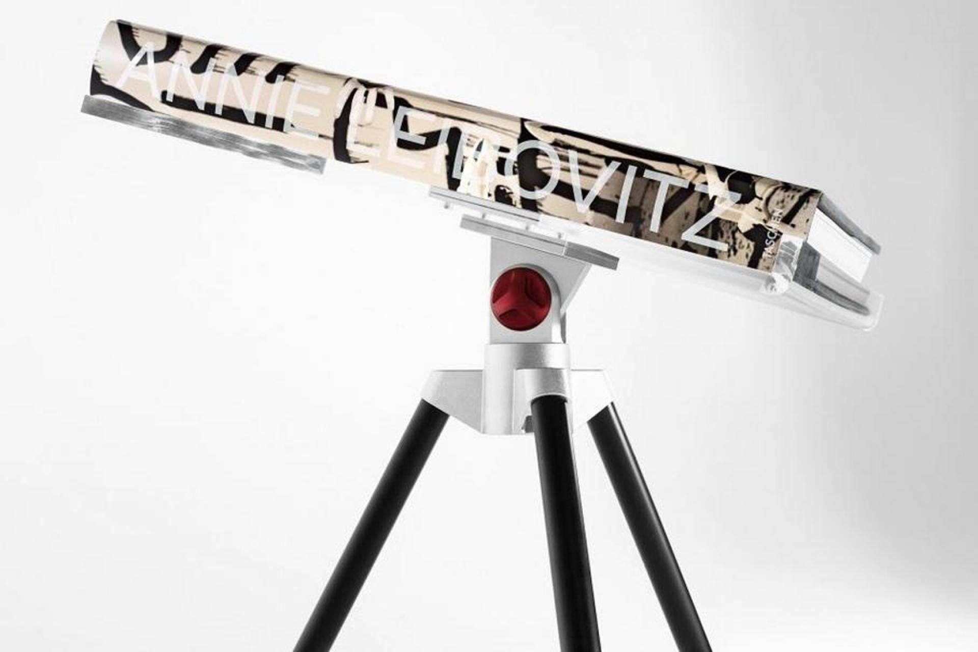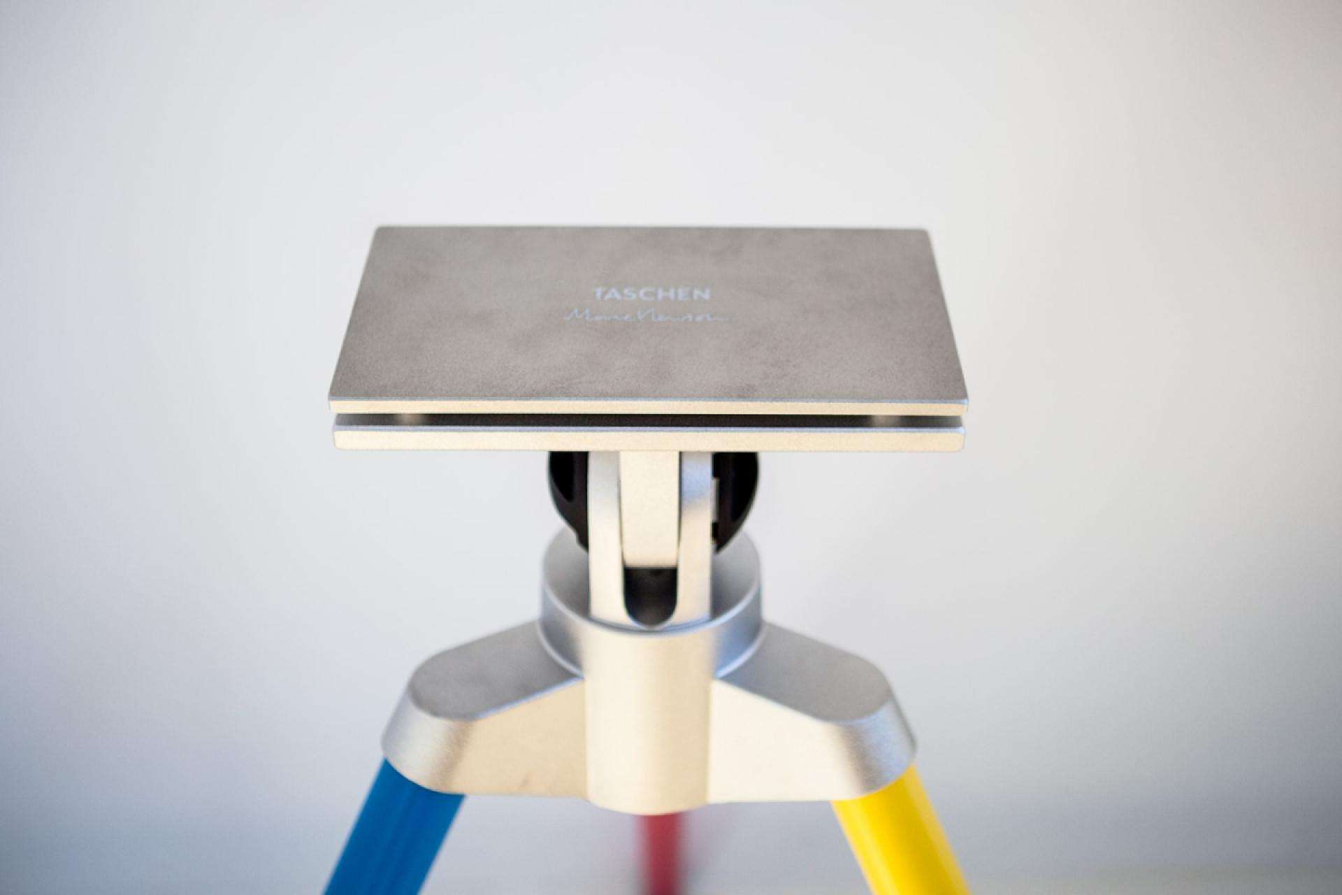 The Leibovitz’s book tripod was produced in a black color with a red knob (a nod to the design of the famous Manfrotto photographic tripods.); Hockney’s one has blue, yellow and red legs to recall his design.