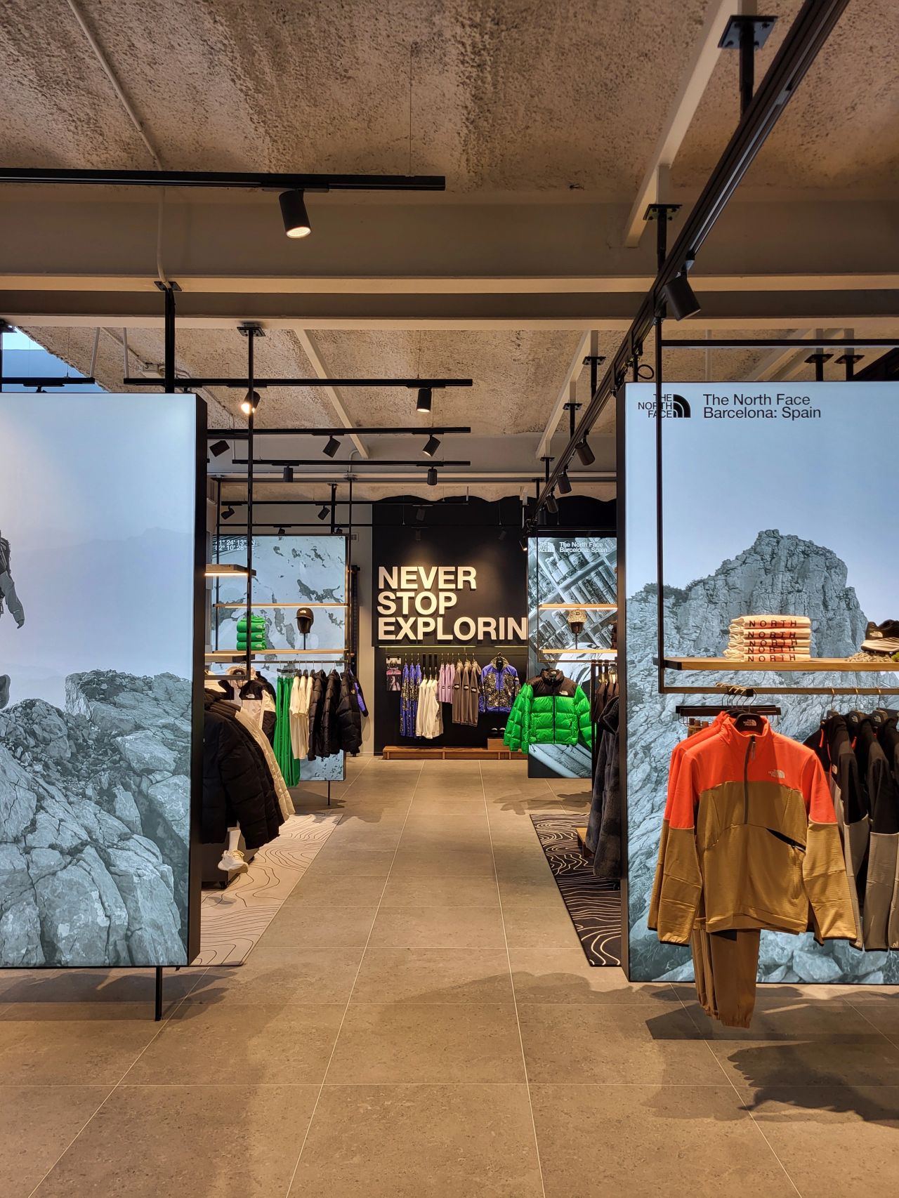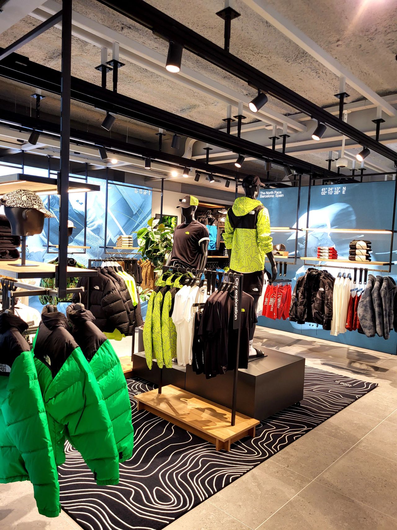 The new North Face store in Barcelona spans 450 m² and offers a dynamic shopping experience focused on urban exploration and mountain equipment, beautifully displayed on ALU’s Acrobat ceiling-mounted system.
