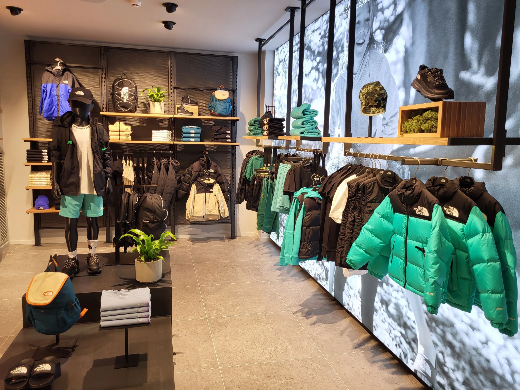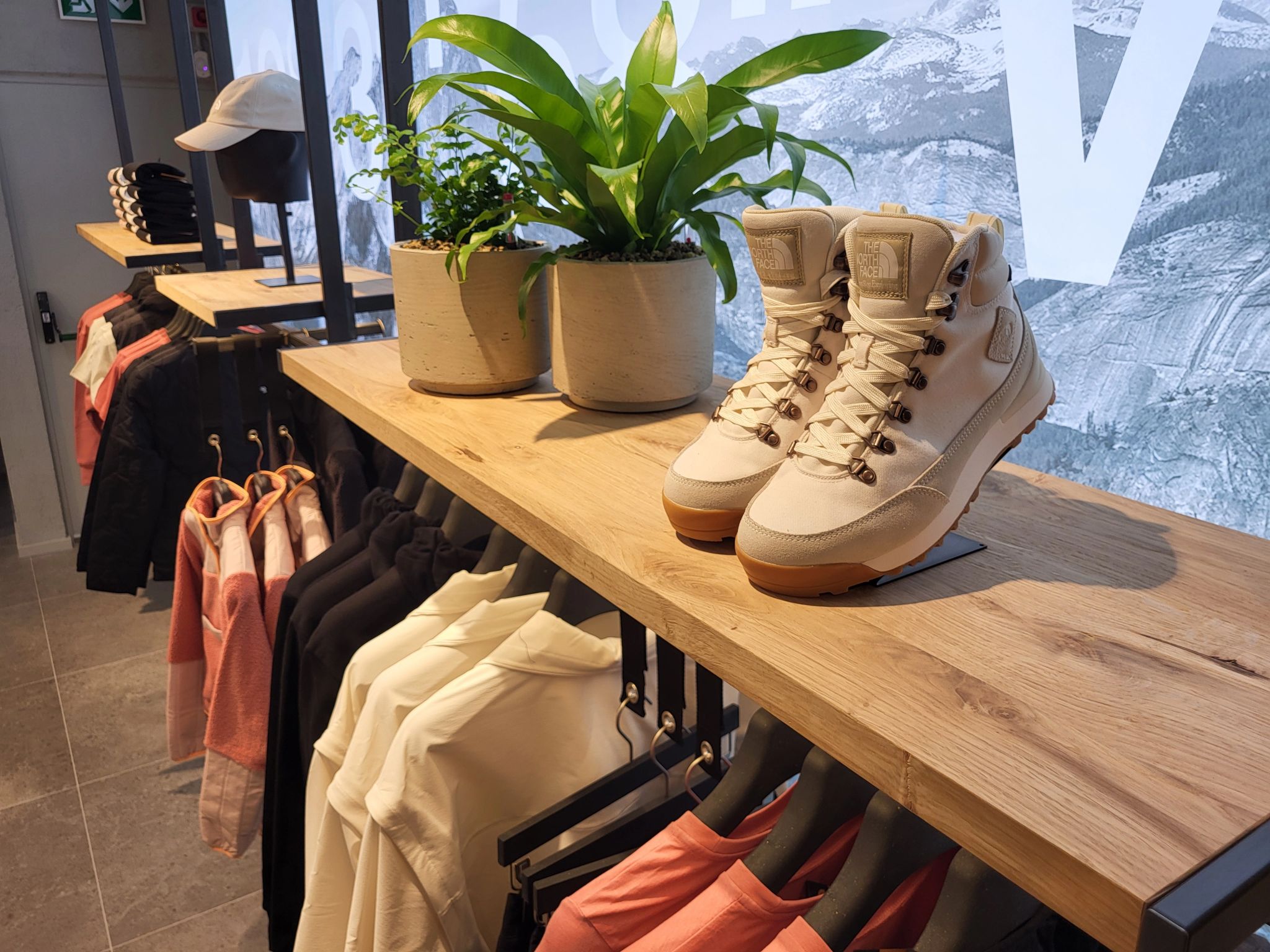Paired with illuminated wooden shelves, this setup adds a modern yet rugged aesthetic that complements The North Face’s identity. From shoes to hats and sweatshirts, every product finds its perfect spot.