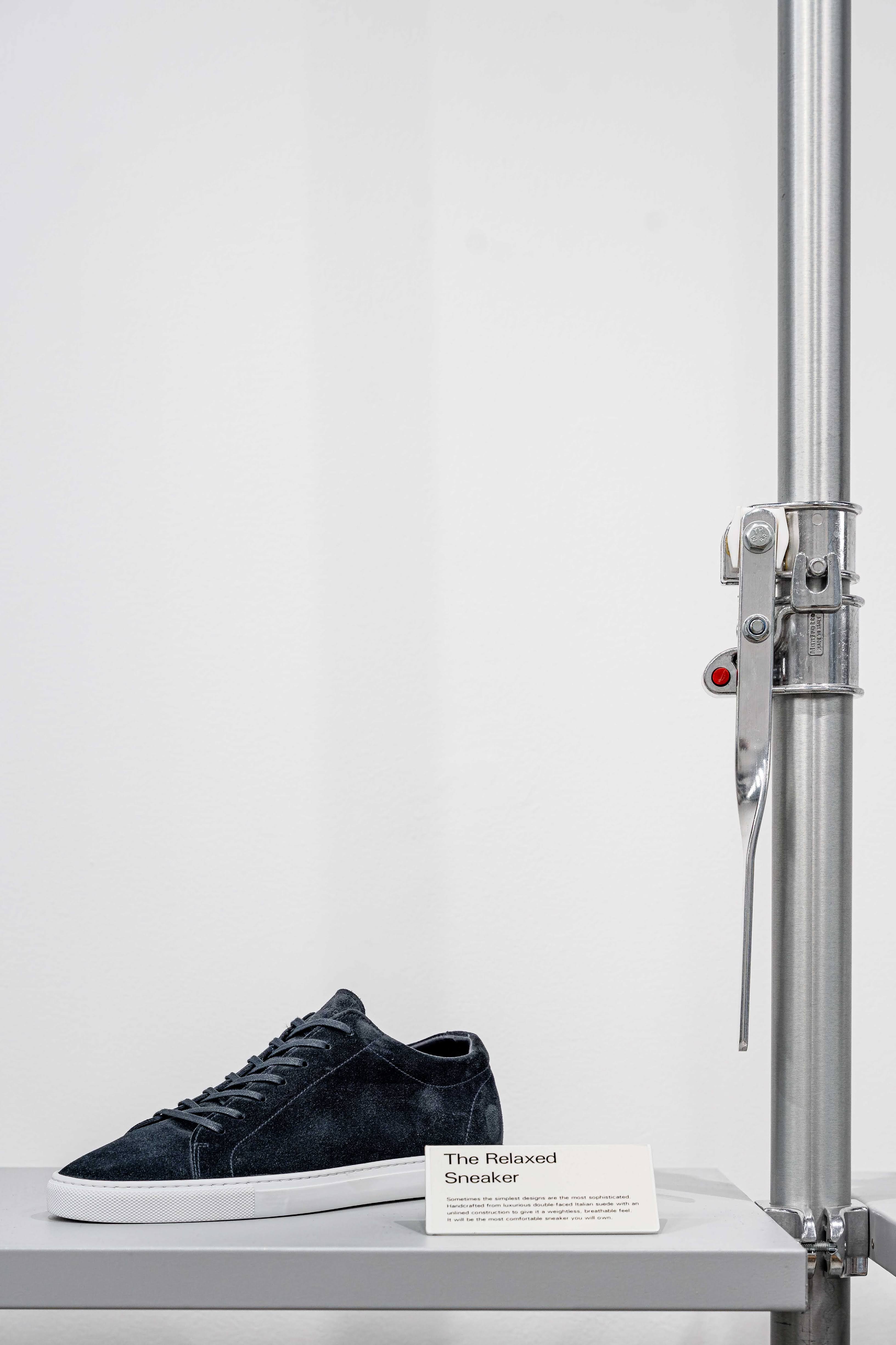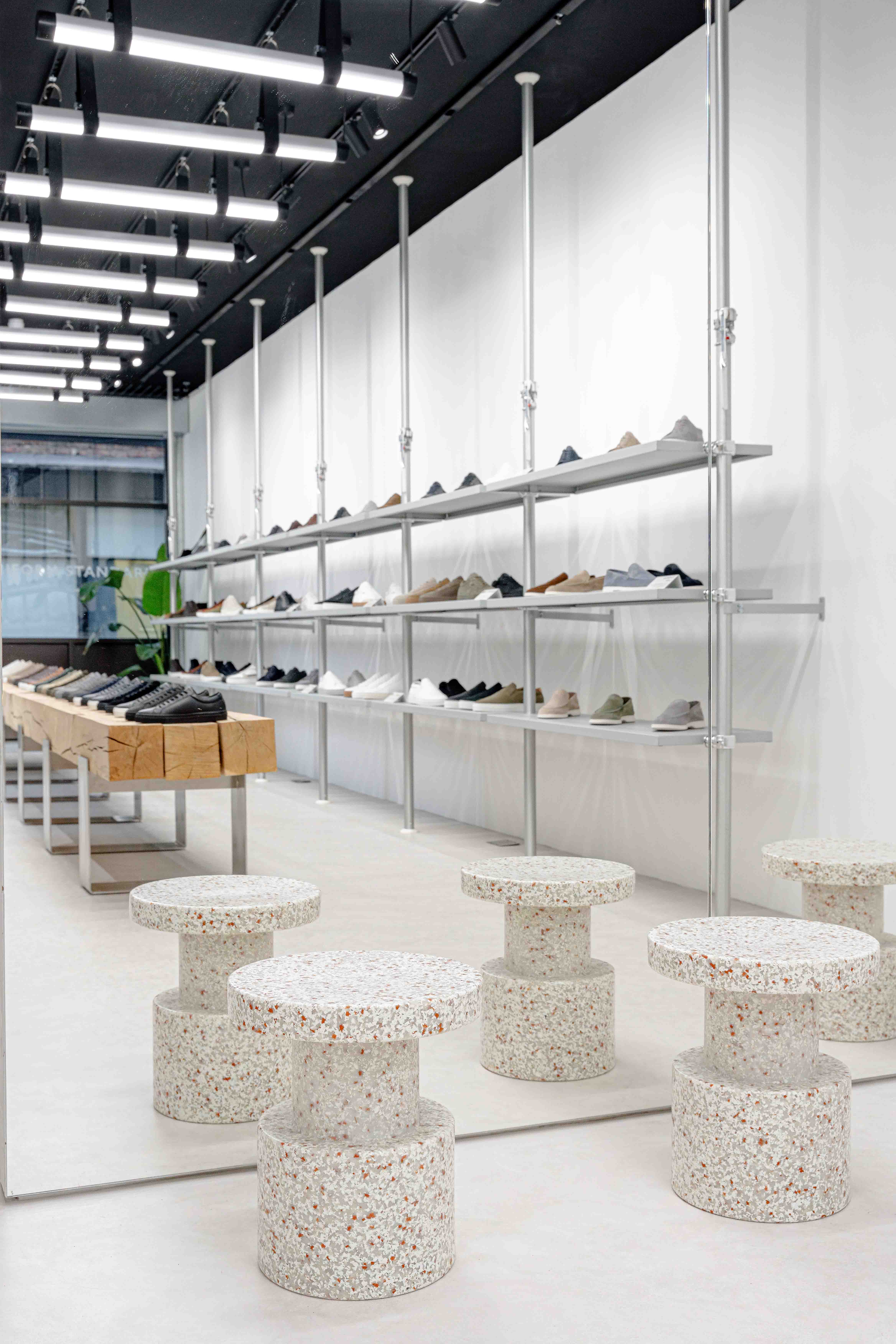 Always available in stock, Autopole is also part of the MoMA Architecture & Design Collection. The entire sneaker series of Uniform Standard is displayed on wall mounted Autopole and Fast-Grip shelves, allowing customers to try on their perfect size. The pop-up also presents men’s and women’s apparel and accessories collection.