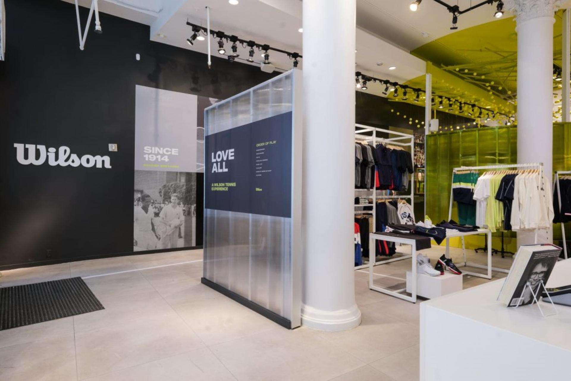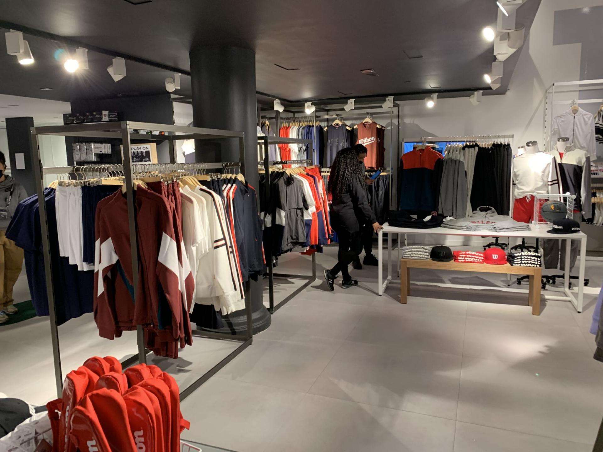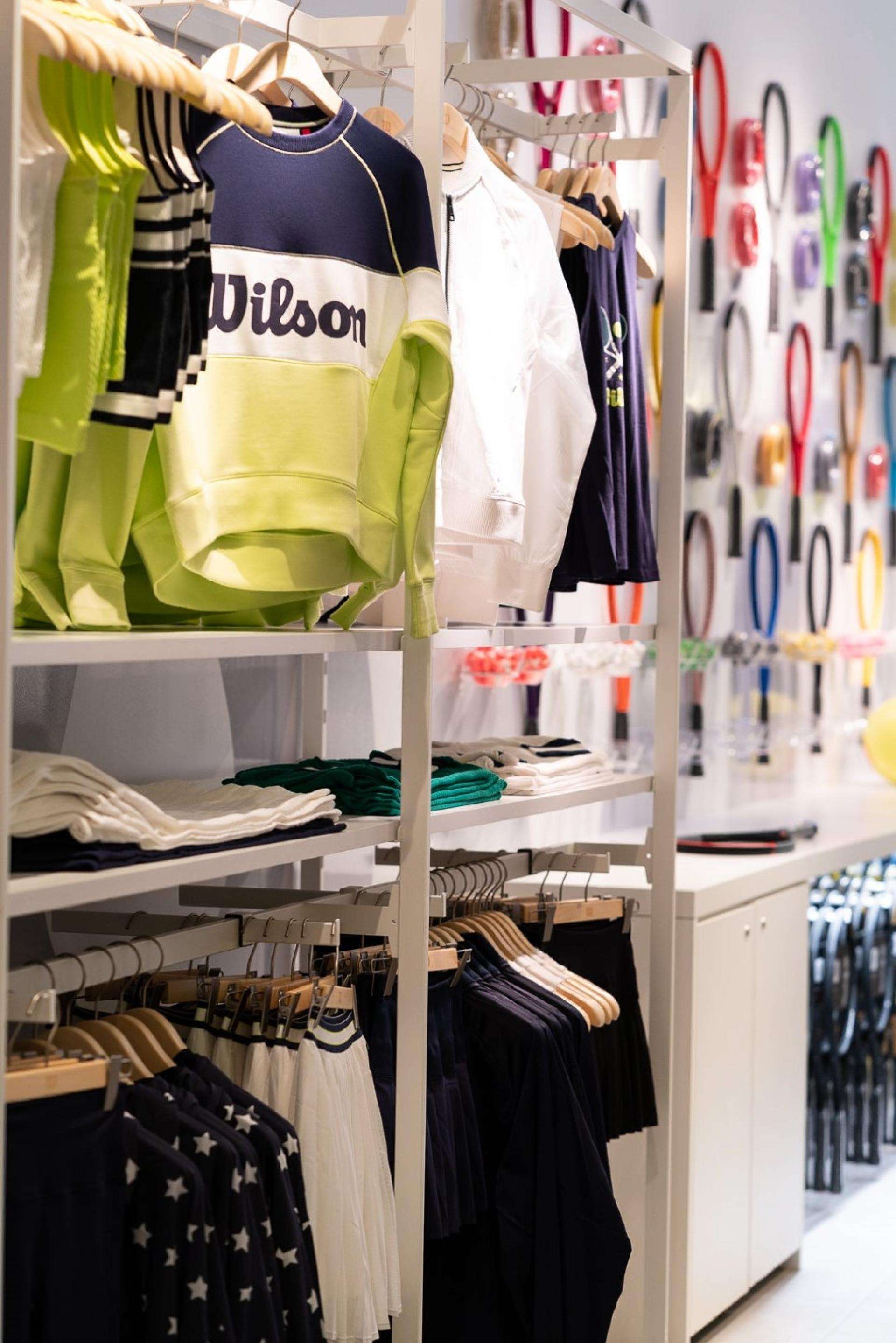 Slash flex units are used in the middle of the space along with vertical units in standard finish and powder white to display Wilson sportwear, including its latest tennis-inspired apparel collection for men and women.