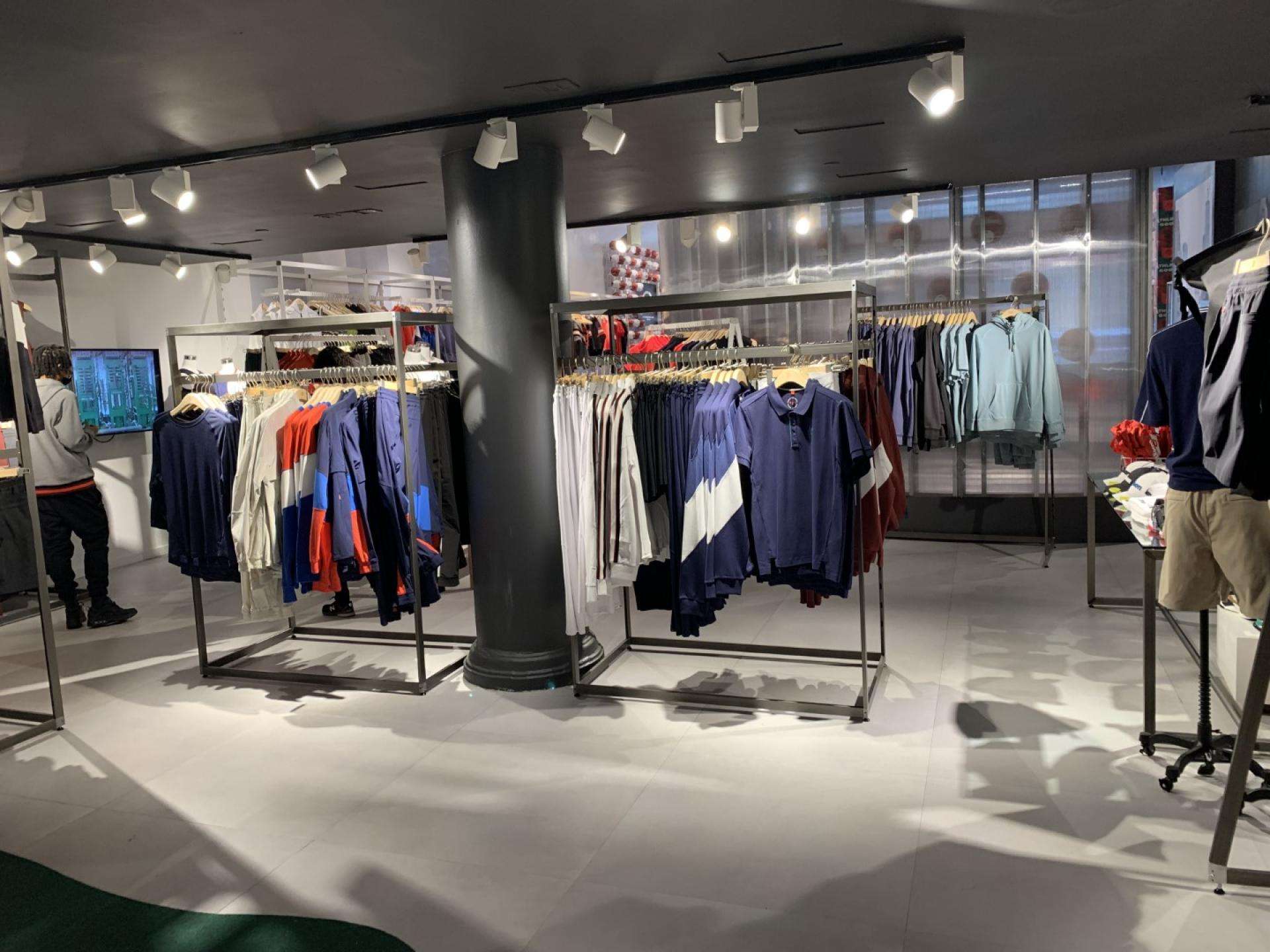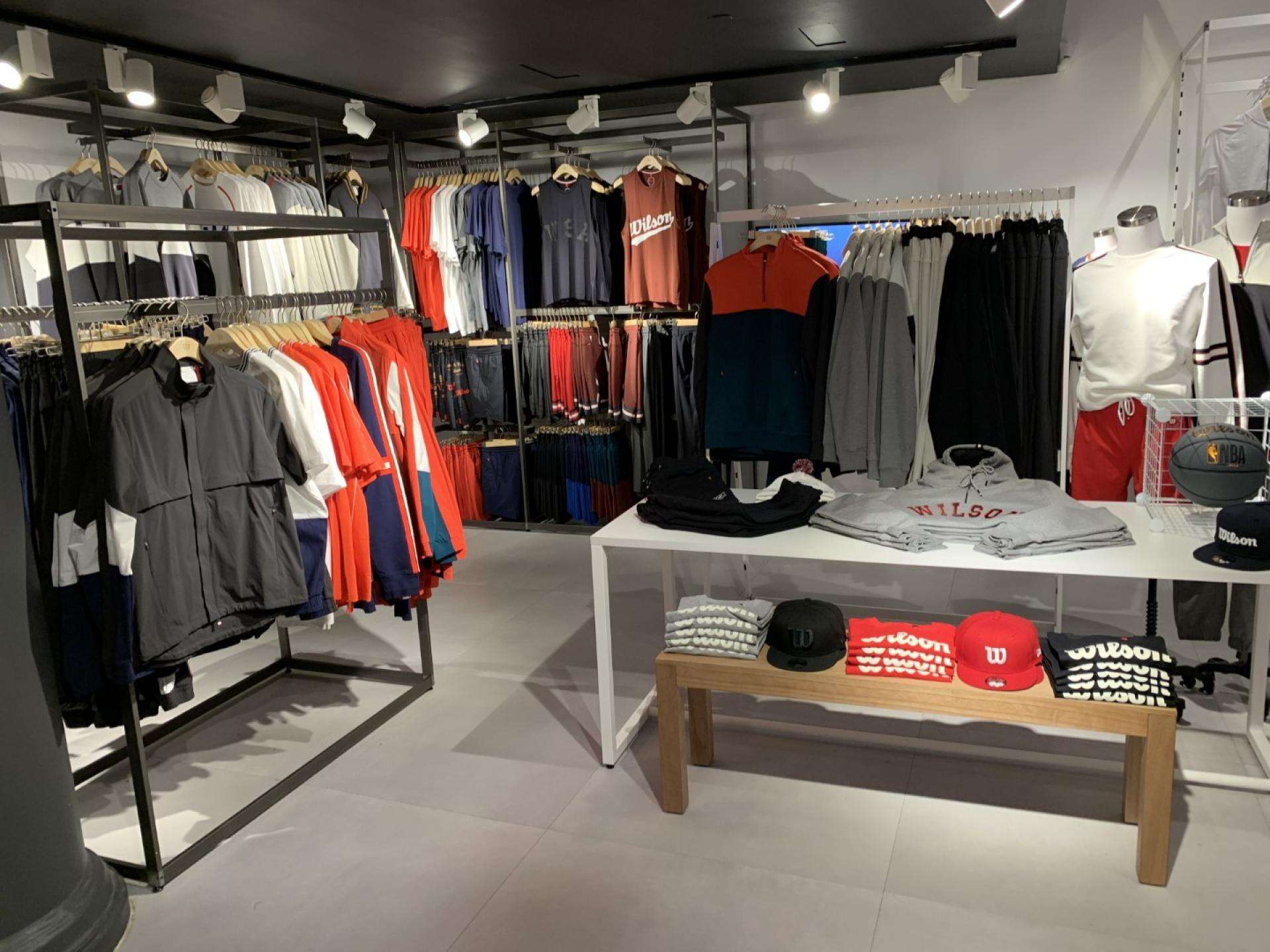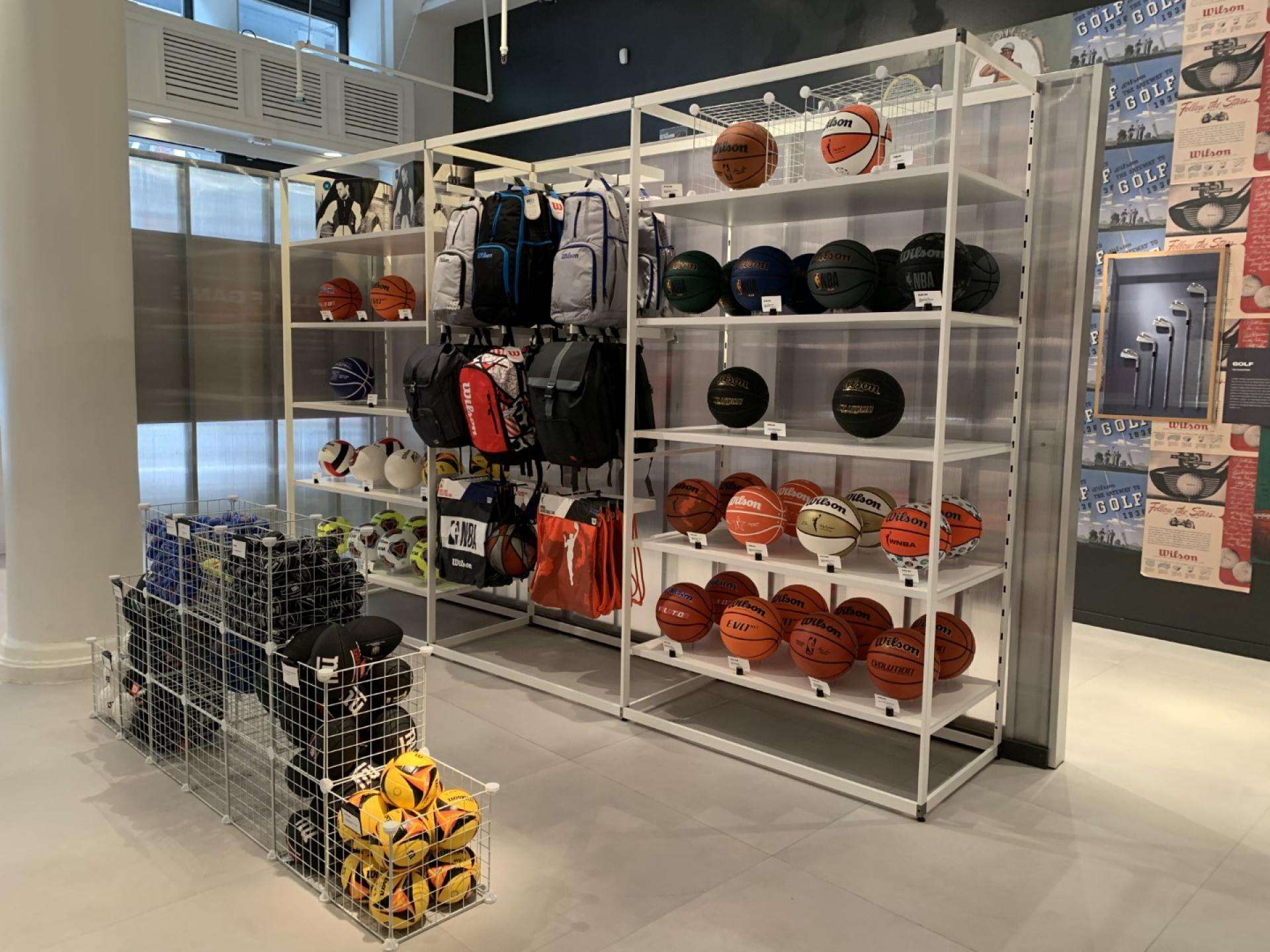 Slash flex units are used in the middle of the space along with vertical units in standard finish and powder white to display Wilson sportwear, including its latest tennis-inspired apparel collection for men and women.