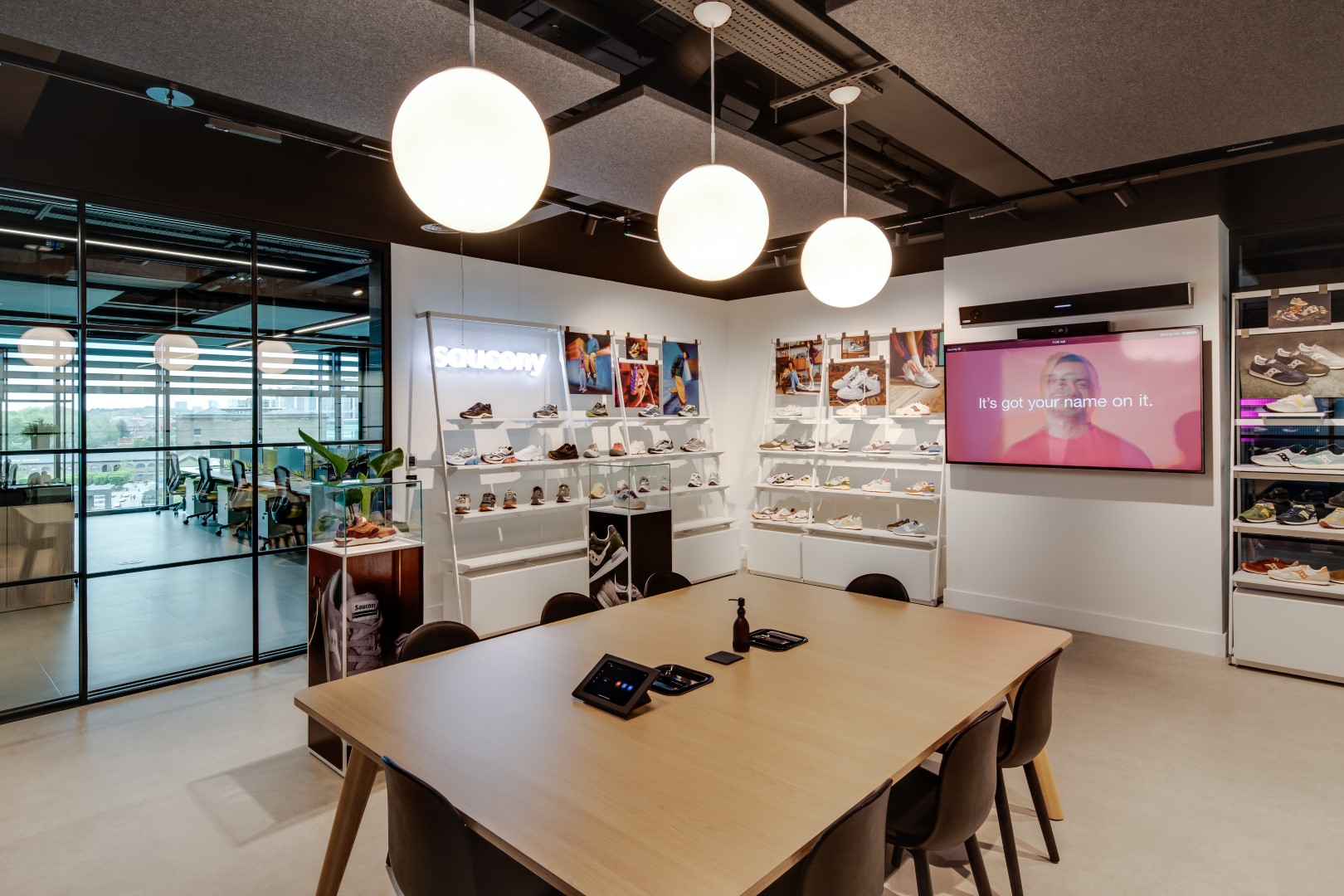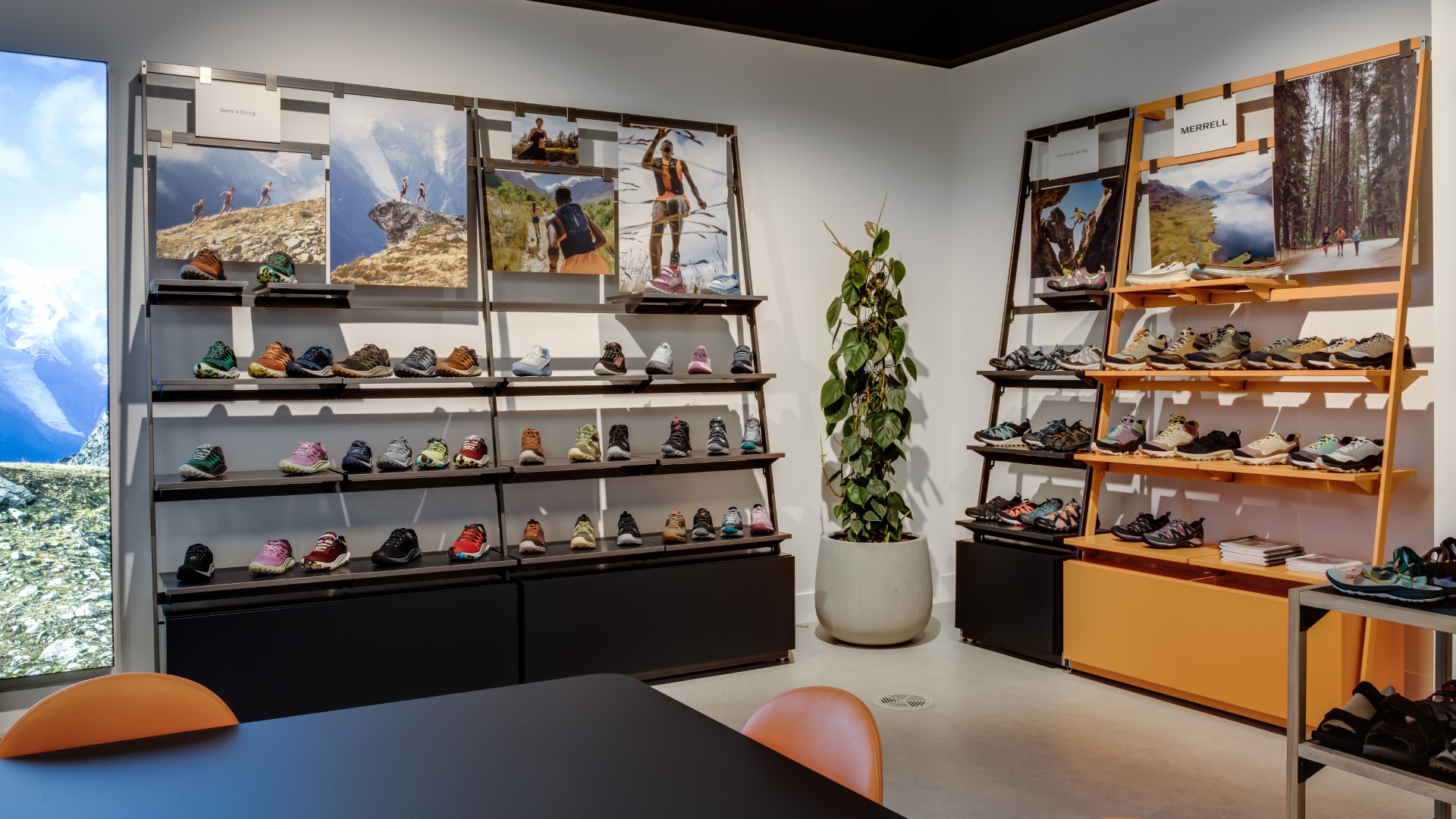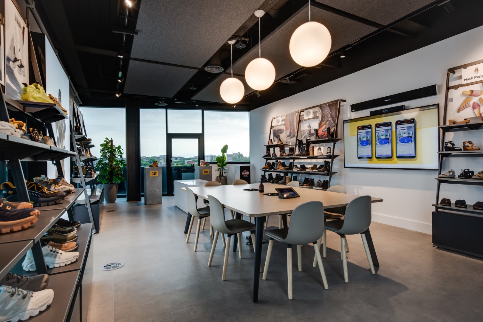 Showcasing Wolverine’s esteemed brands, including Merrell, Saucony, and Caterpillar, the space features both freestanding and wall-mounted Slash units, providing an immersive experience for clients and partners.